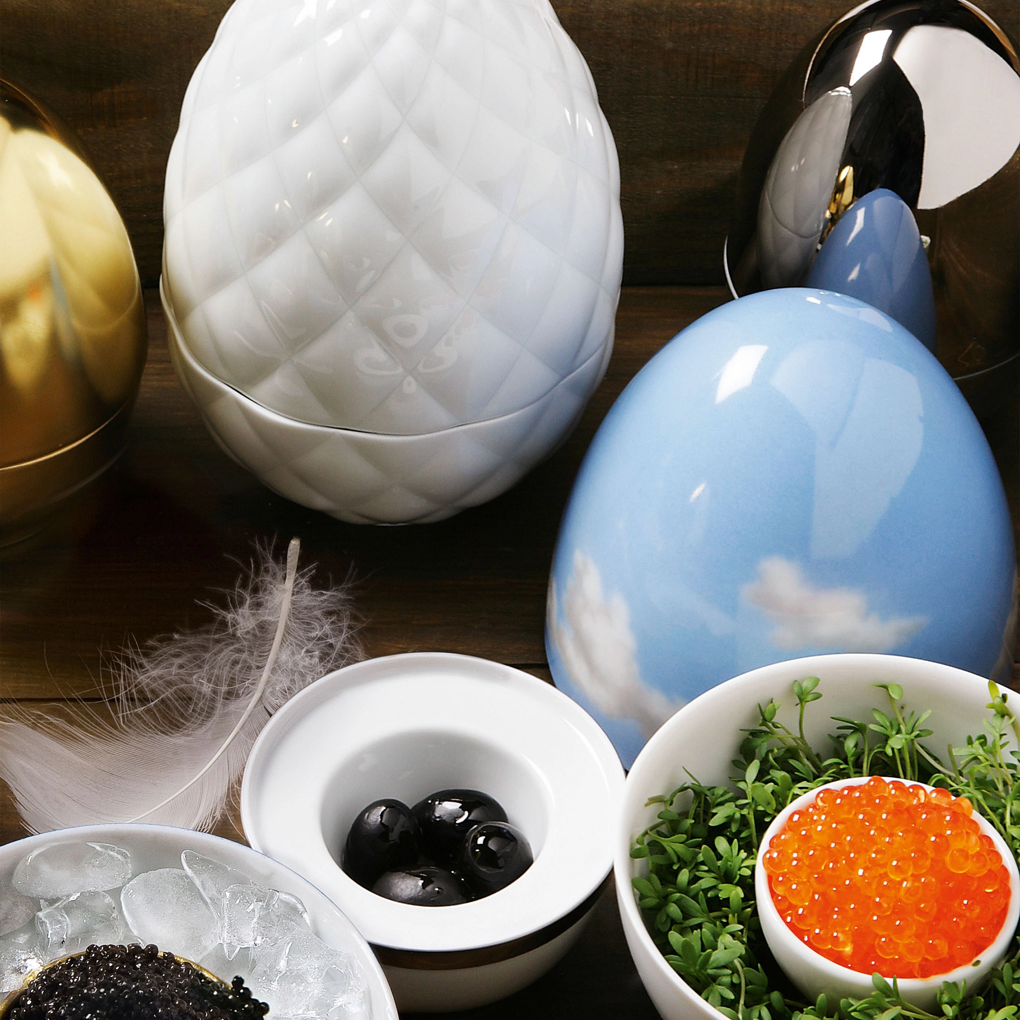 Duży kieliszek na jajko z porcelany w białym kolorze dekorowany motywem diamentów o wysokości 14.5cm z kolekcji MATROSCHKA. Stworzony z najwyższej jakości porcelany przez Sieger by Fürstenberg zachwyca elegancką formą i pomysłowością. Dostępny w dwóch rozmiarach inspirowany lalką Matrioszka, która składa się z figur, które można umieszczać jedna w drugiej. Porcelanowy kieliszek do jajek działa na tej samej zasadziem gdzie większa figurka oferuje miejsce na jajko w środku, a obrana skorupa znajduje miejsce w istniejącej wnęce. Można go dowolnie wypełnić ulubionymi składnikami! Klasyczna biel kubka prezentuje się idealnie na brunchu, natomiast wersja złota dodaje luksusu na wielkanocnym stole. Te piękne kieliszki do jajek nie tylko przechowują jajko w elegancki sposób, ale również stanowią urokliwe elementy dekoracyjne, nawiązujące do folklorystycznych figur.