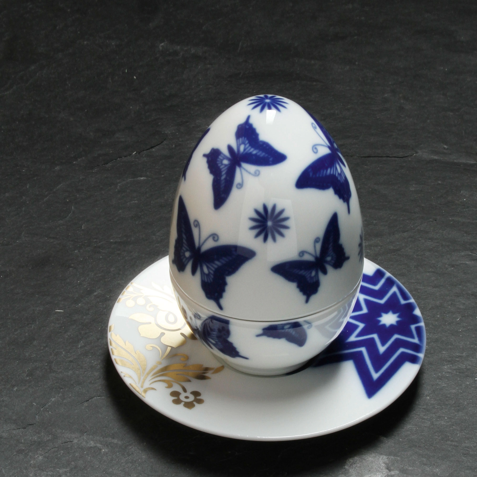 • Kieliszek na jajko z motywem niebieskich motyli z kolekcji MATROSCHKA