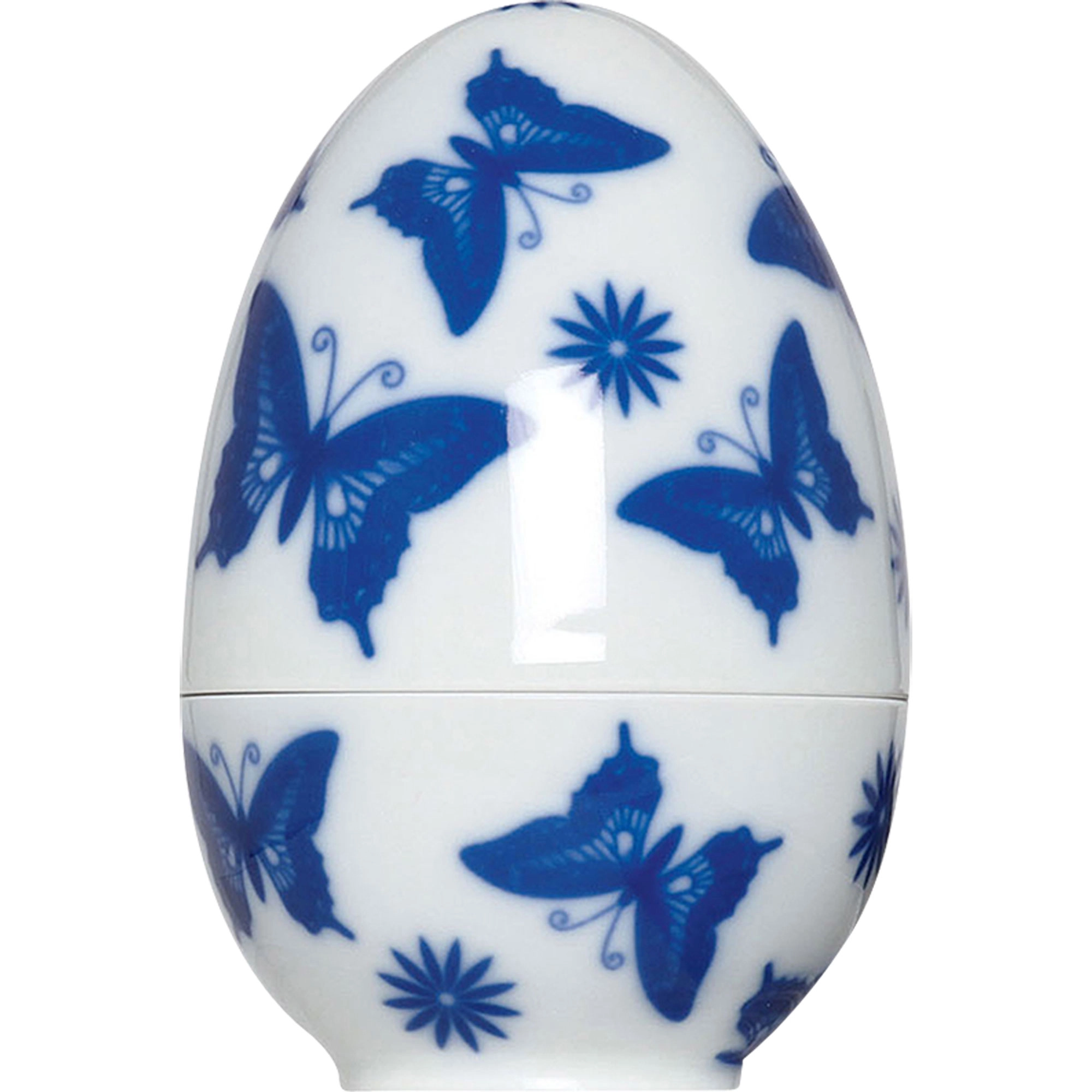 Kieliszek na jajko z porcelany w białym kolorze z motywem niebieskich motyli o wysokości 10.9cm z kolekcji MATROSCHKA. Stworzony z najwyższej jakości porcelany przez Sieger by Fürstenberg zachwyca elegancką formą i pomysłowością. Dostępny w dwóch rozmiarach inspirowany lalką Matrioszka, która składa się z figur, które można umieszczać jedna w drugiej. Porcelanowy kieliszek do jajek działa na tej samej zasadziem gdzie większa figurka oferuje miejsce na jajko w środku, a obrana skorupa znajduje miejsce w istniejącej wnęce. Można go dowolnie wypełnić ulubionymi składnikami! Klasyczna biel kubka prezentuje się idealnie na brunchu, natomiast wersja złota dodaje luksusu na wielkanocnym stole. Te piękne kieliszki do jajek nie tylko przechowują jajko w elegancki sposób, ale również stanowią urokliwe elementy dekoracyjne, nawiązujące do folklorystycznych figur.