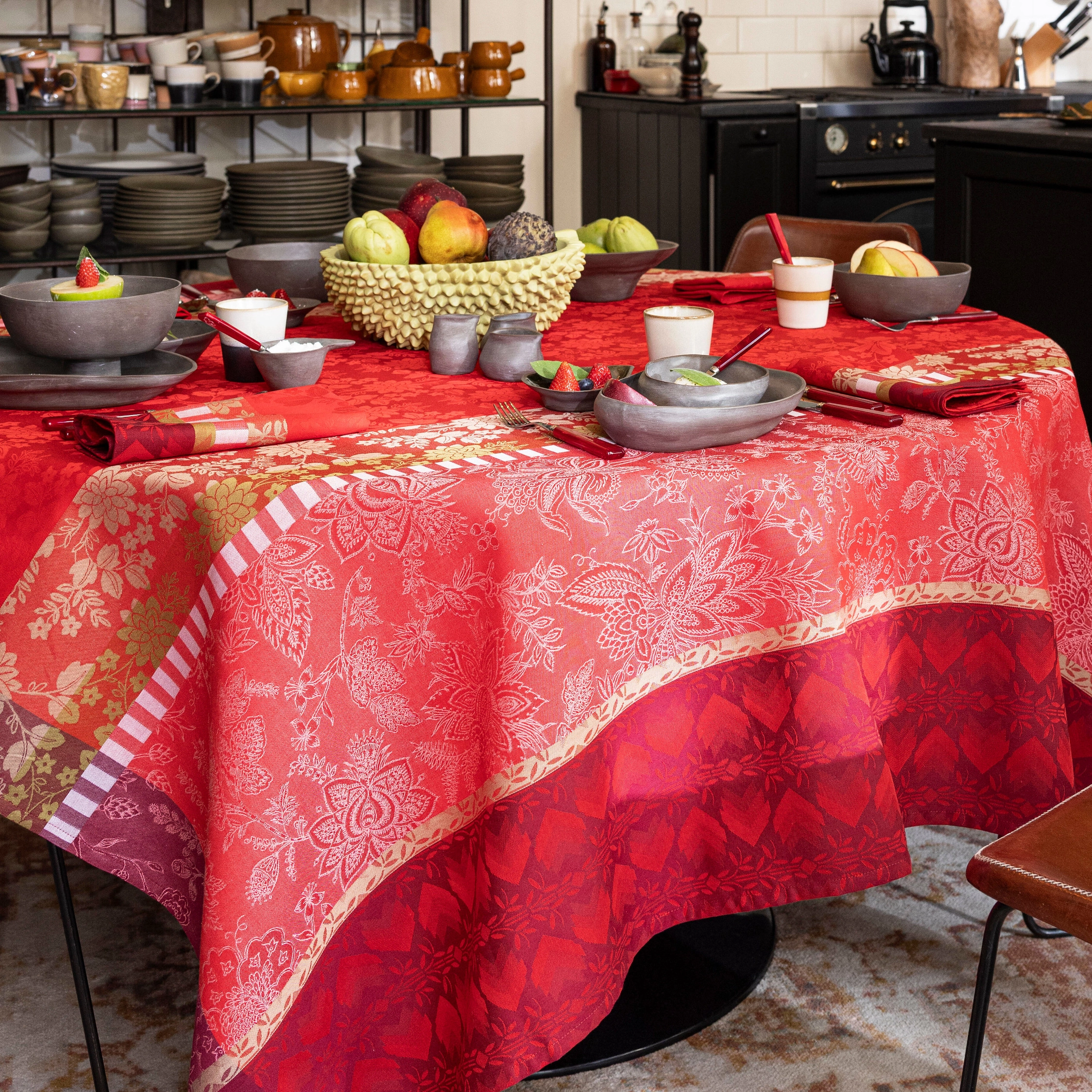 - Bawełniany bieżnik 50 x 150 cm w kolorze czerwonym z kolekcji Gipsy od Le Jacquard Francais.