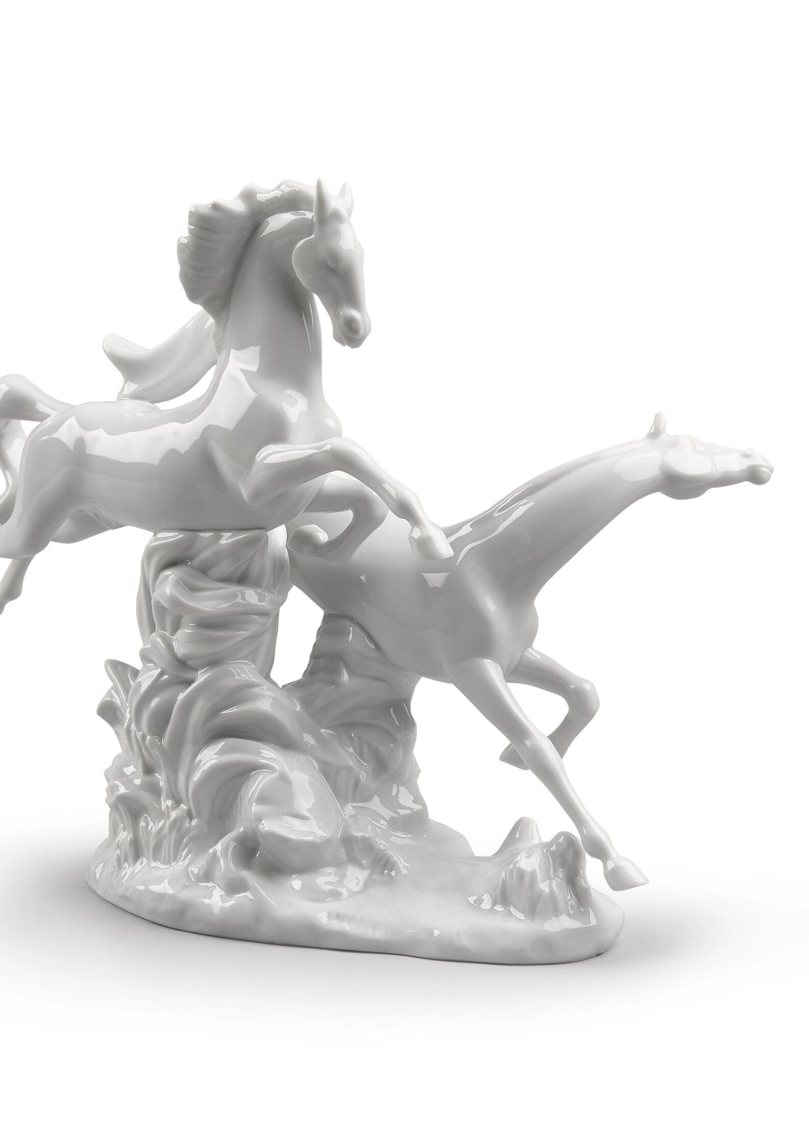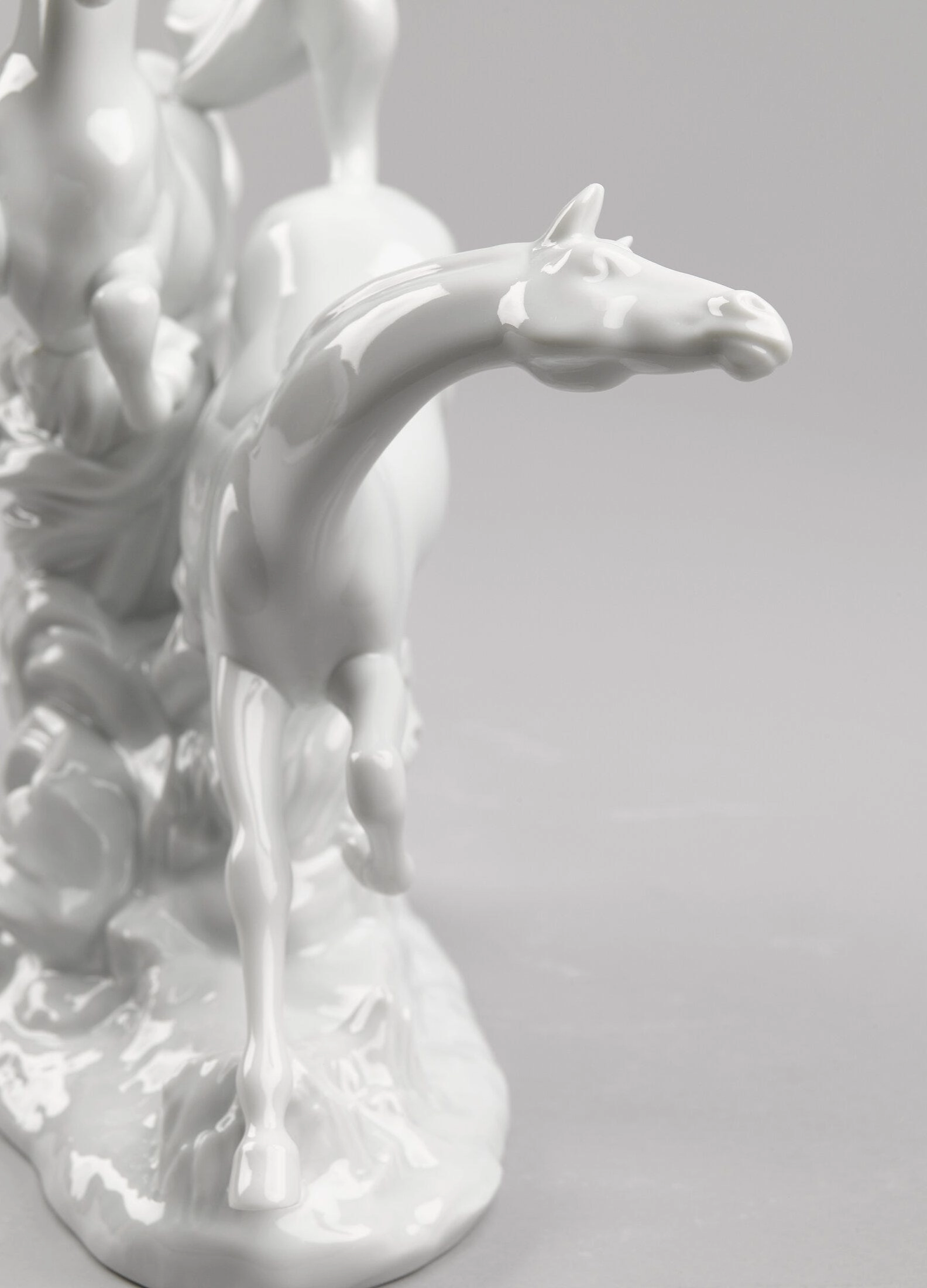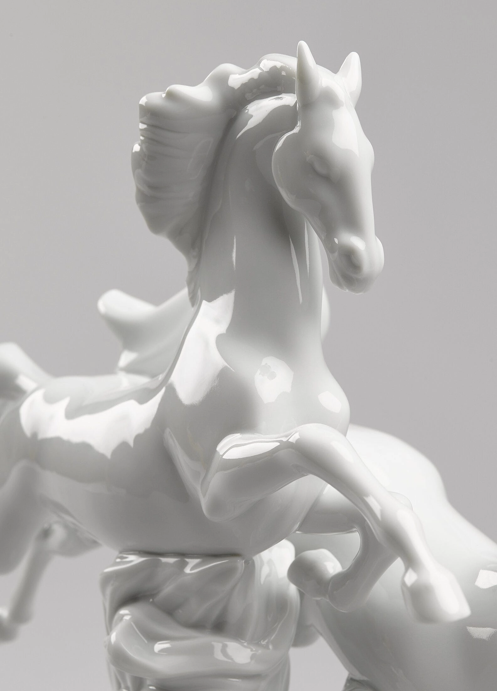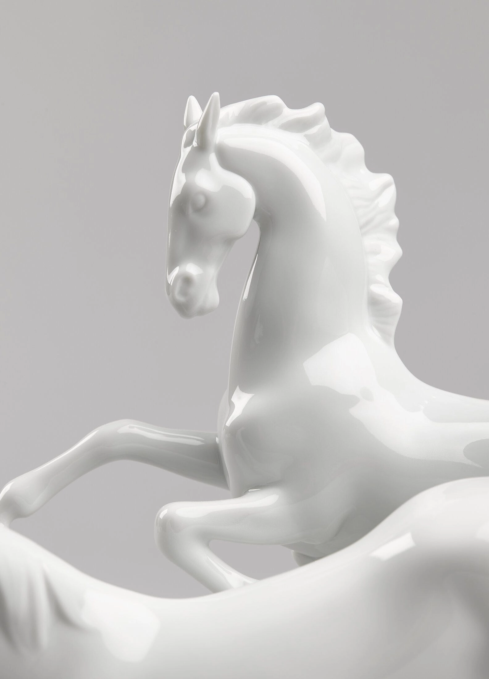 - Figurka dwóch galopujących koni z białej porcelany w połysku.