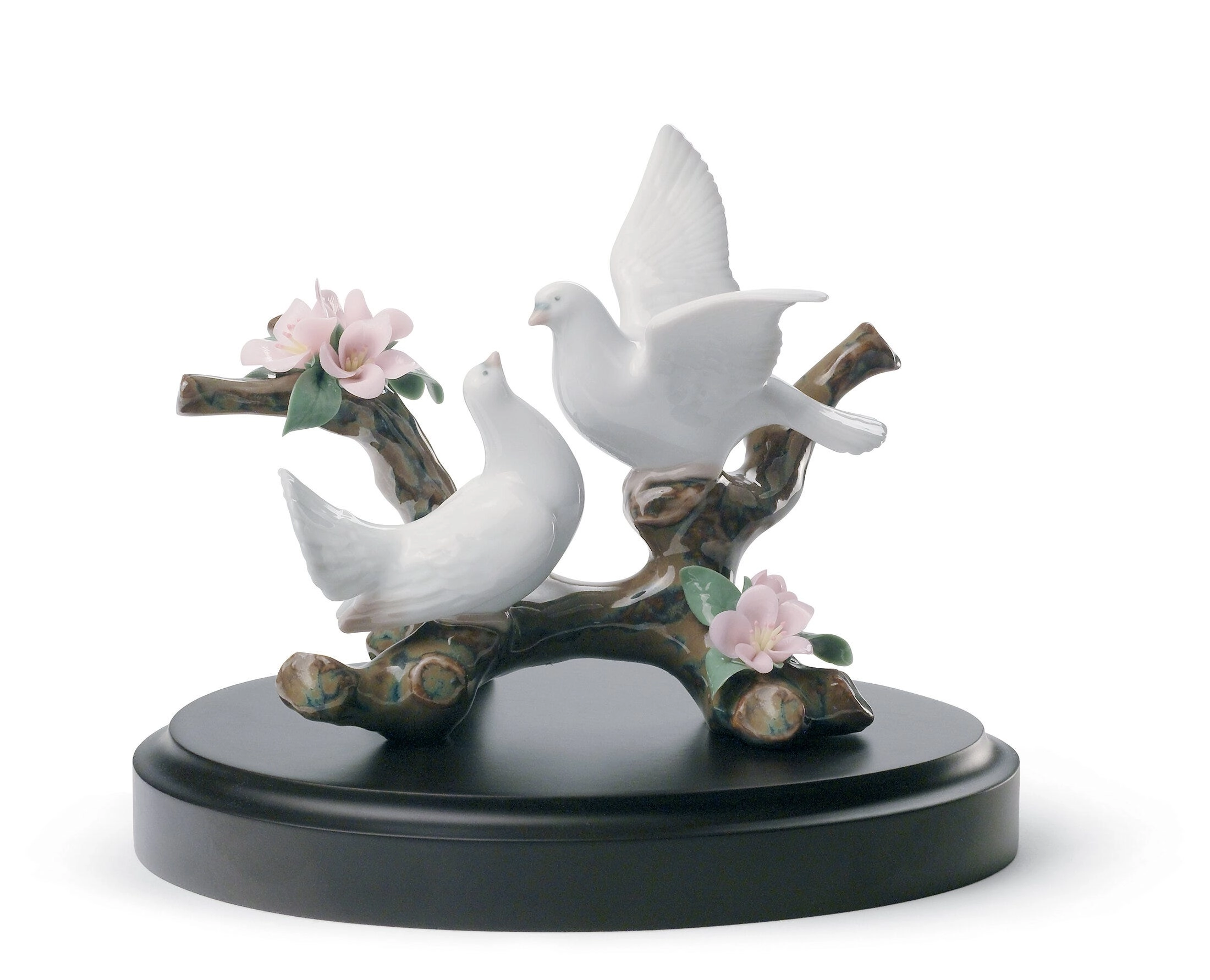 - Figurka przedstawiająca dwa gołębie siedzące na gałęzi z kwiatami wiśni.