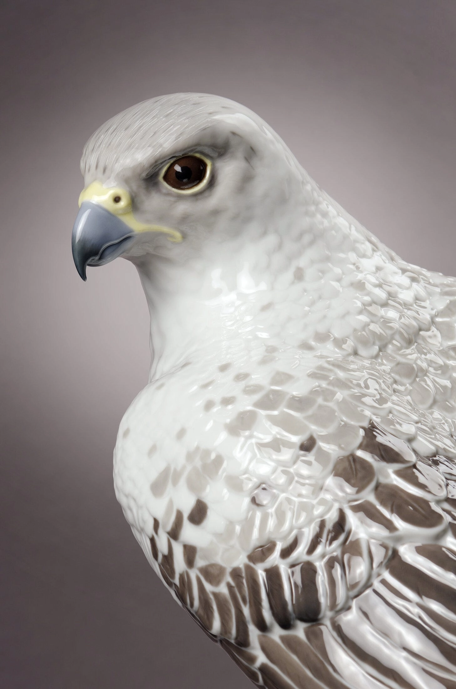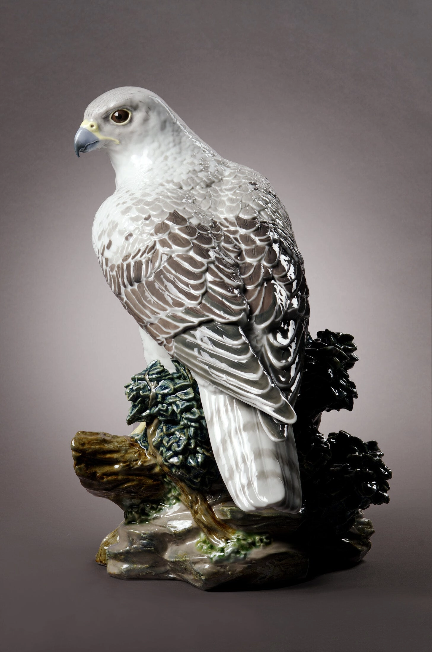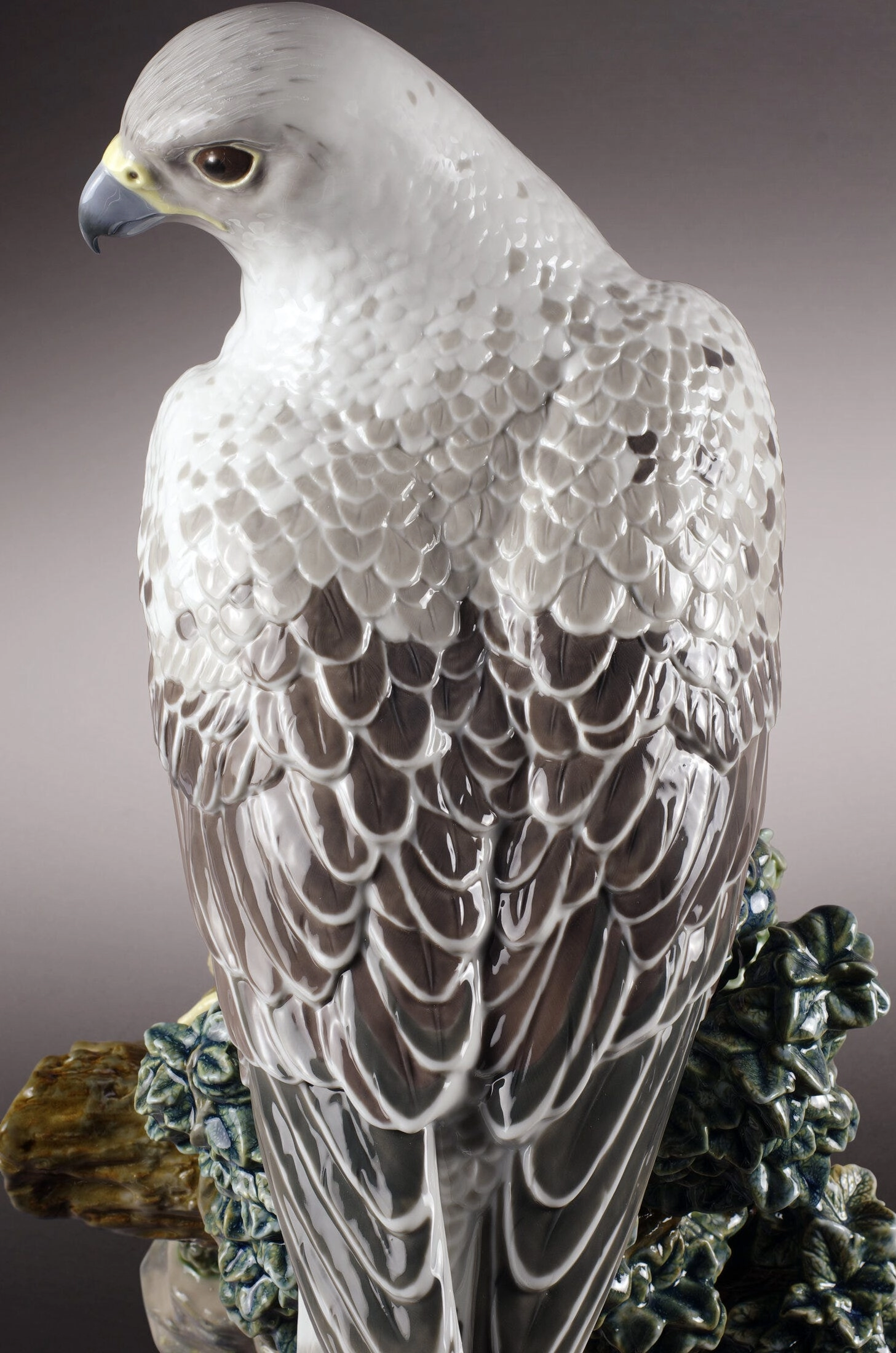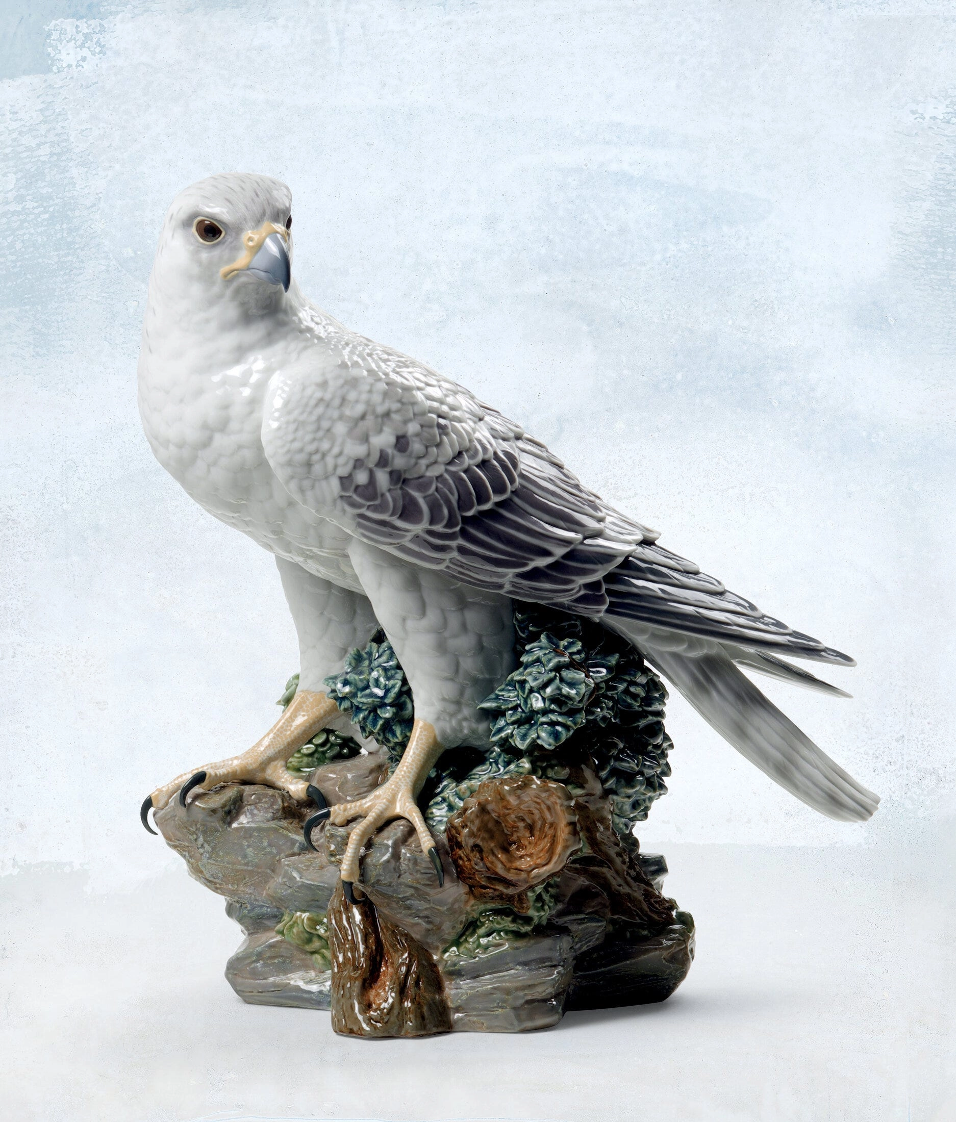 - Figurka porcelanowa przedstawiająca sokoła Gyrfalcon na skale.