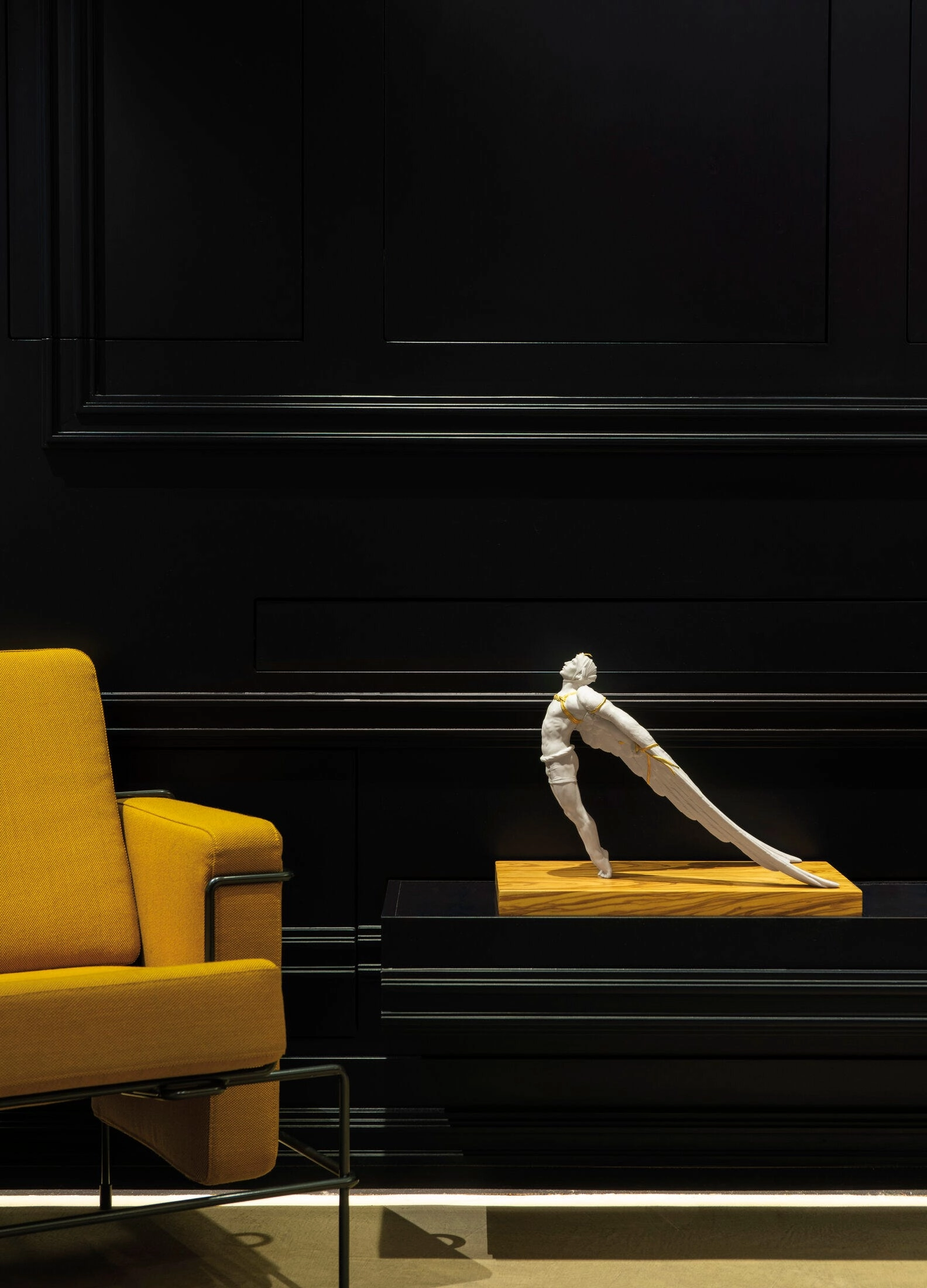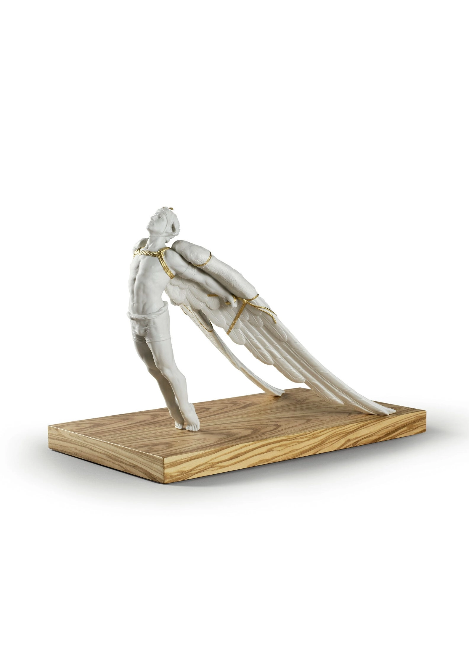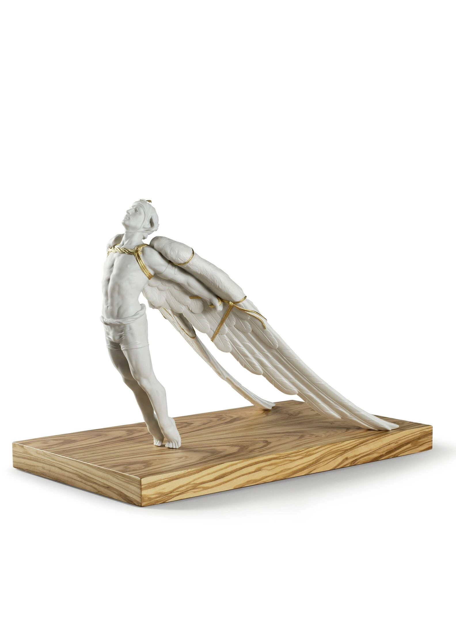 - Matowa porcelanowa figurka Ikara, bohatera mitologii greckiej, na drewnianej podstawie.