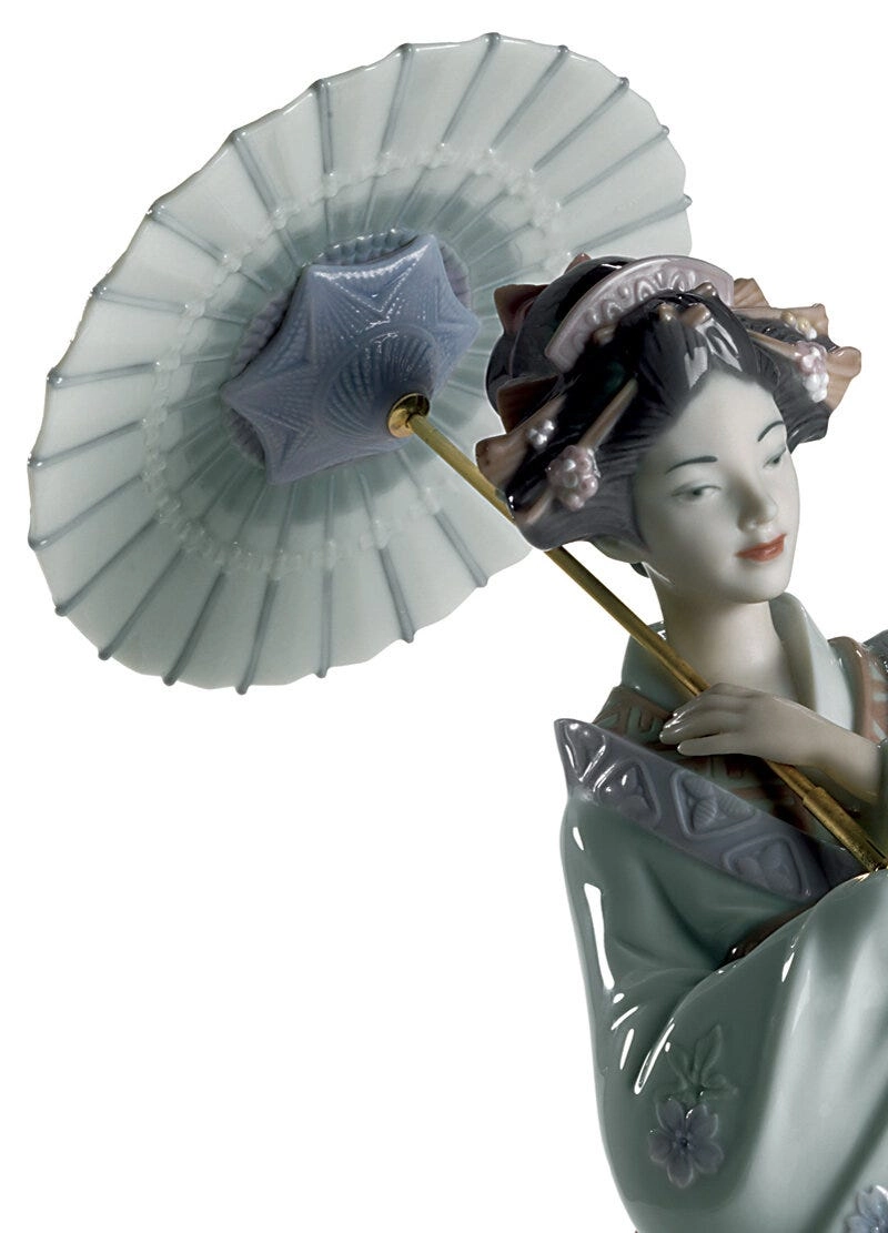 - Porcelanowa figurka Japonki z parasolką i latającym żurawiem.