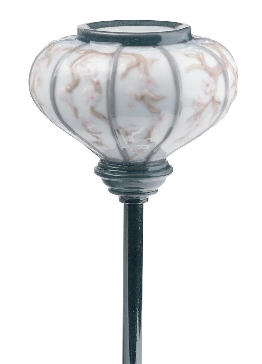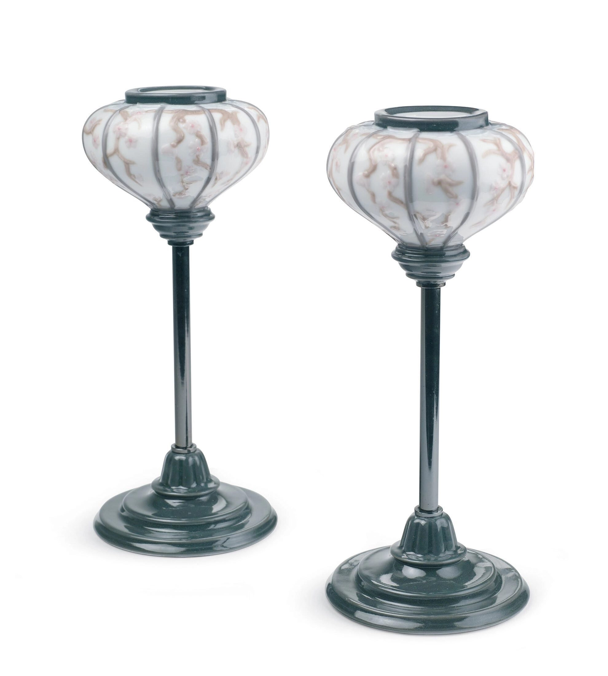 - Figurka dwóch japońskich latarni zdobionych kwiatowymi motywami.