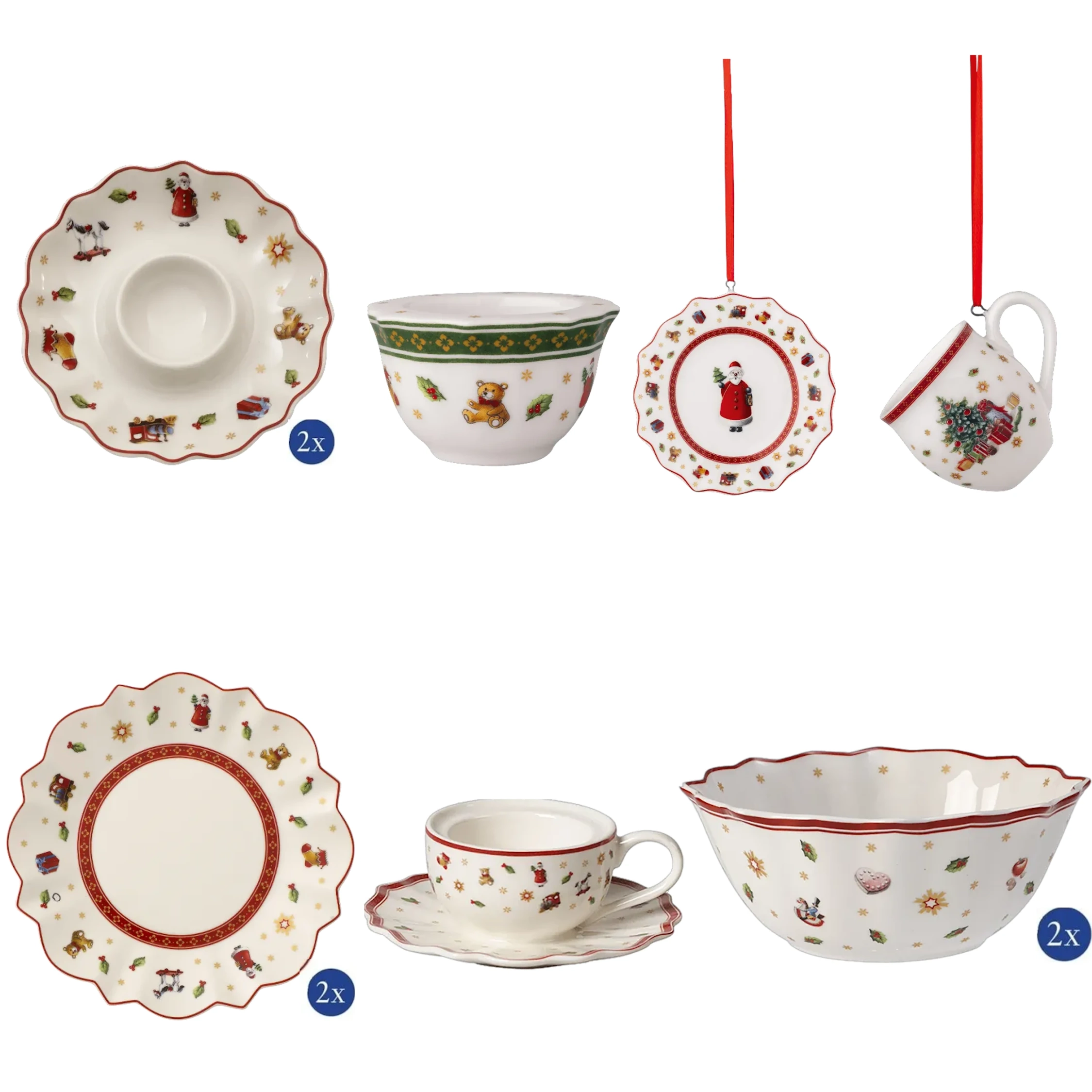 W zestawie znajdziemy zestaw świąteczny dla dwojga, czyli 2 x talerz sałatkowy biały z choinką, 2 x talerzyk biały B&B, 2 x miseczka, 2 x kubek z unikatowym wzorem, 2 x kieliszki na jajka. Oprócz nich różnego rodzaju miseczki na dipy, świeczniki czy zawieszki.