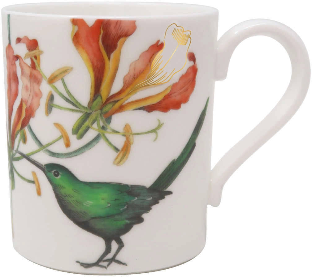 Kubek porcelanowy z kolekcji Avarua. Inspiracją do stworzenia kolekcji Avarua był brytyjski odkrywca James Cook, który w 1773 roku odkrył grupę wysp na Pacyfiku, nazwaną później archipelagiem Cook'a. Stolicą wysp Cooka jest właśnie przepiękna, kolorowa Avarua. Wykwintna, bogata dekoracja na szlachetnej porcelanie kostnej pozwoli wprowadzić egzotyczną, pełną barw atmosferę w Twoim wnętrzu i na Twoim stole. Przewijające się motywy kwiatów - czerwona Gloriosa superba, namorzyny, liście Strelicji i barwnych kolibrów - na niebieskim lub czysto białym tle pozwalają odkrywać fantazyjną faunę i florę każdego dnia. Całość dopełniają przepiękne detale z prawdziwego złota, które nadają całości trójwymiarowego wyglądu i niezwykłej elegancji. Wprowadź egzotyczną i wykwintną kolekcję Avarua do swojego domu!