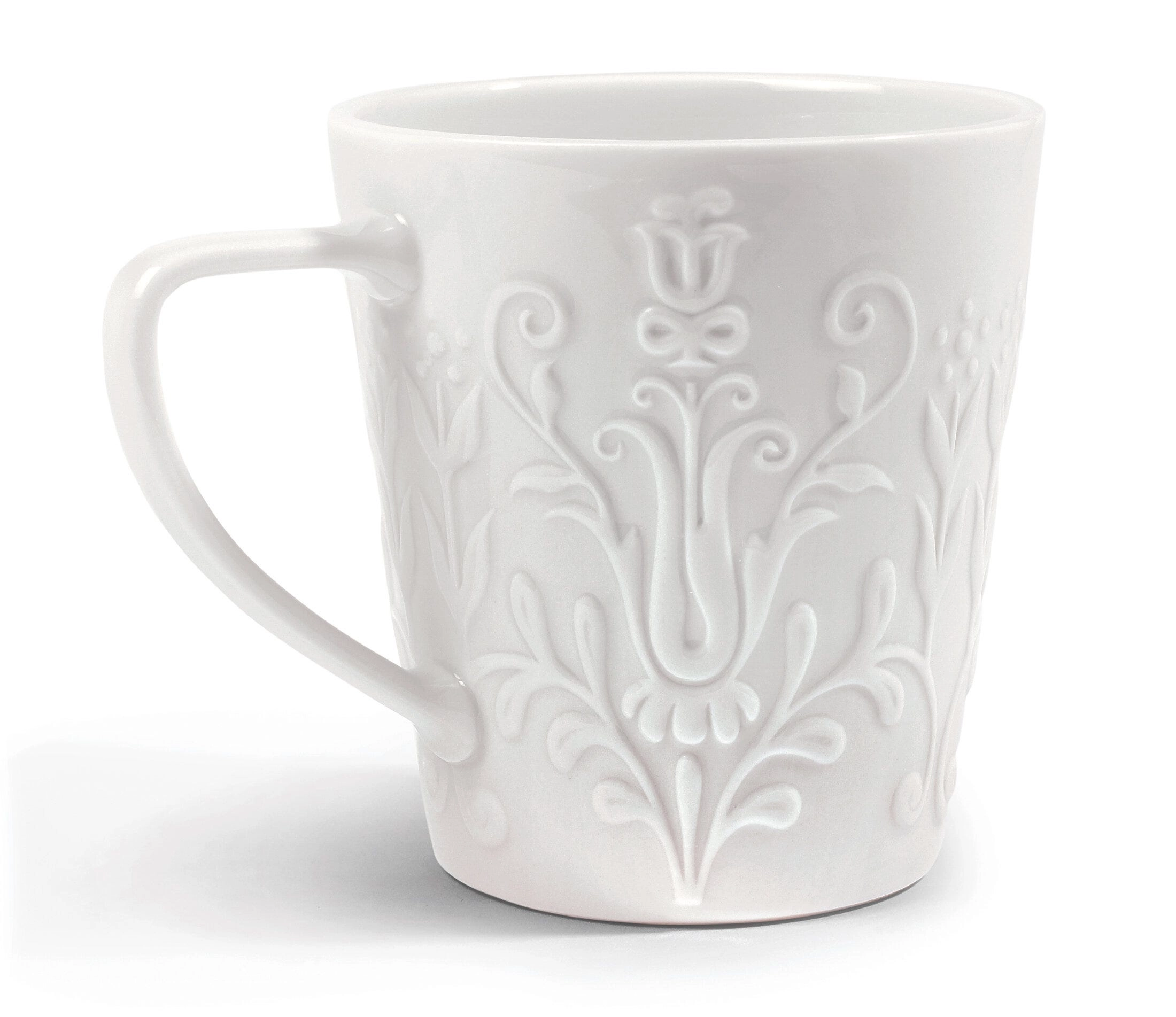 • Biały kubek z błyszczącej porcelany z kwiatowym motywem.