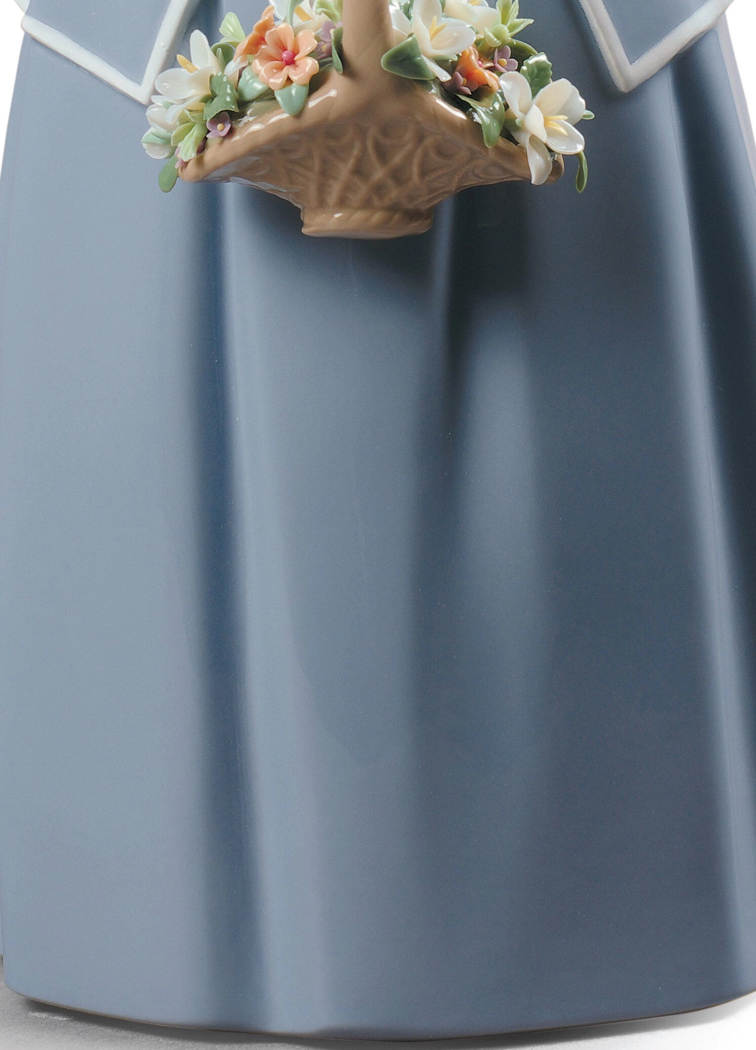 - Błyszcząca figurka kobiety z koszem pełnym kwiatów w niebieskiej sukni.