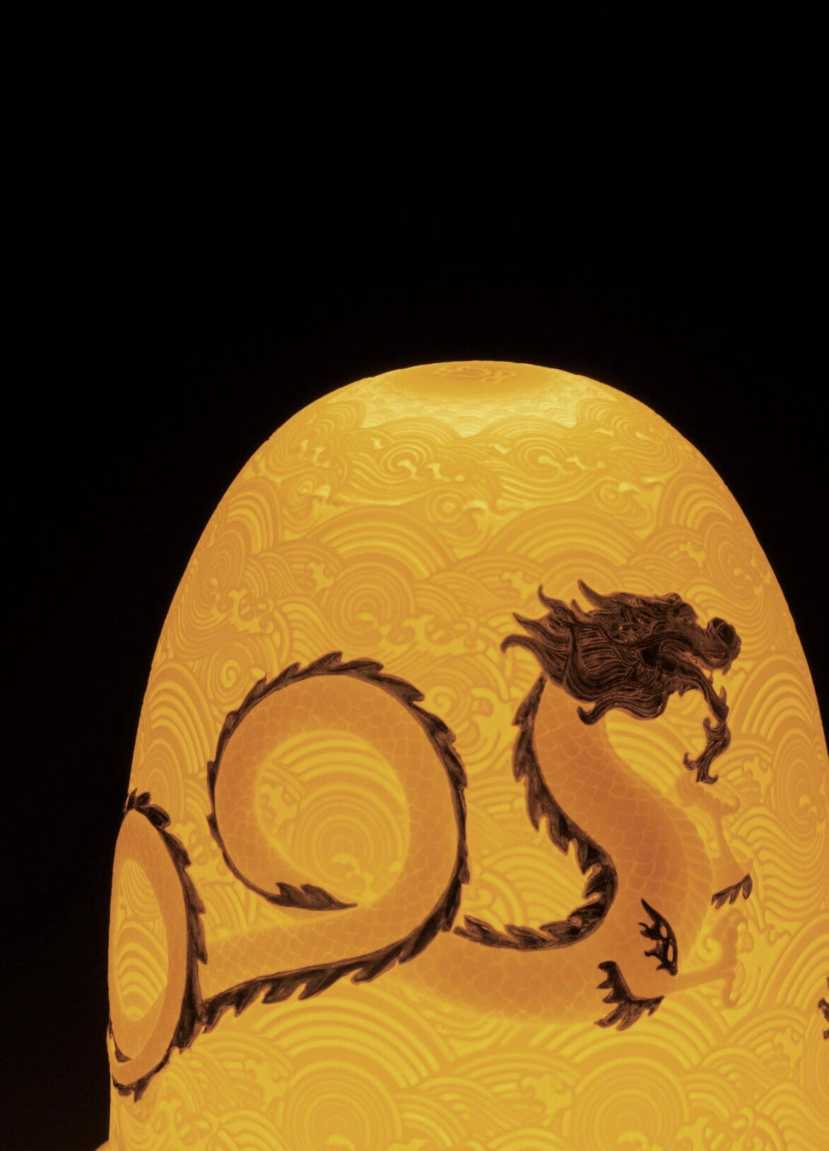 - Bezprzewodowa porcelanowa lampa z kopułowym kloszem z motywem smoka ze złotym połyskiem.
