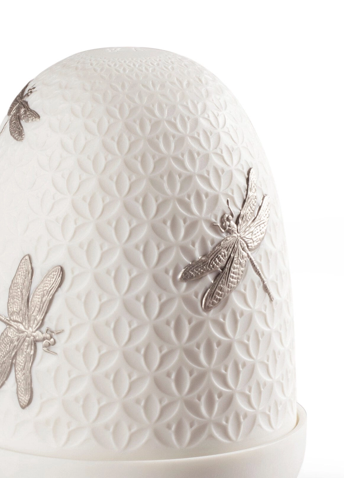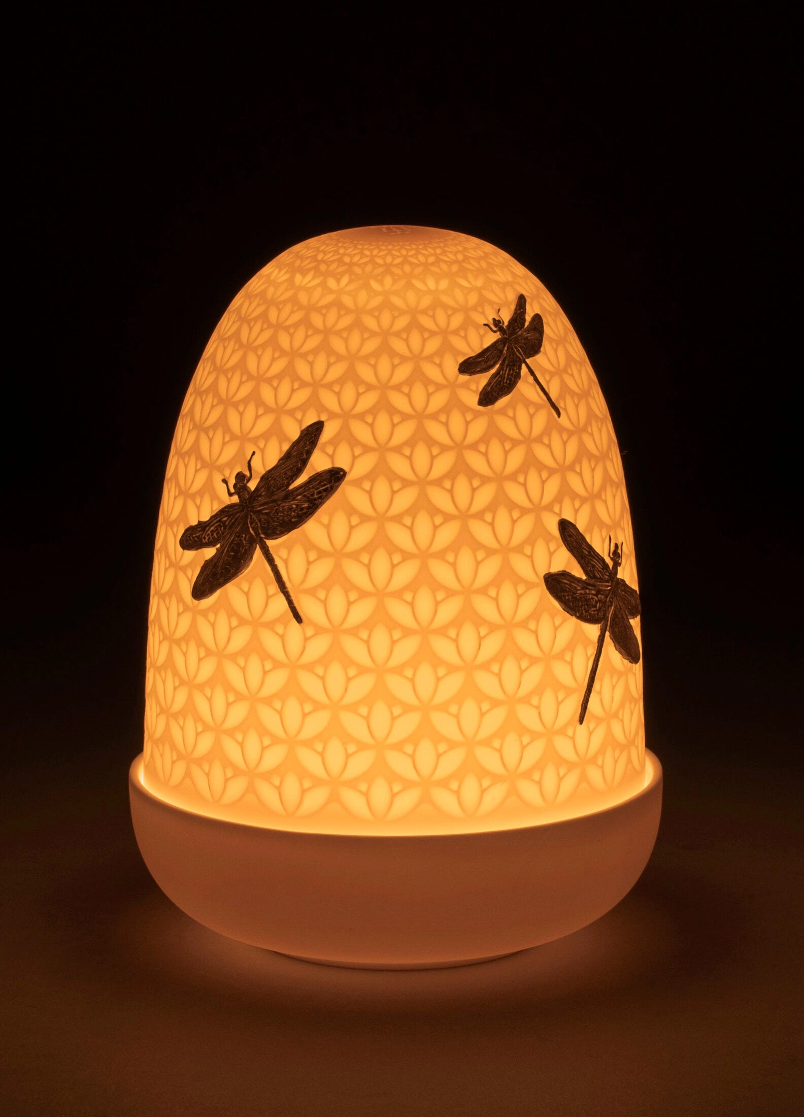 - Porcelanowa lampa bezprzewodowa z kopułowym kloszem ozdobionym ważkami w srebrnym połysku.