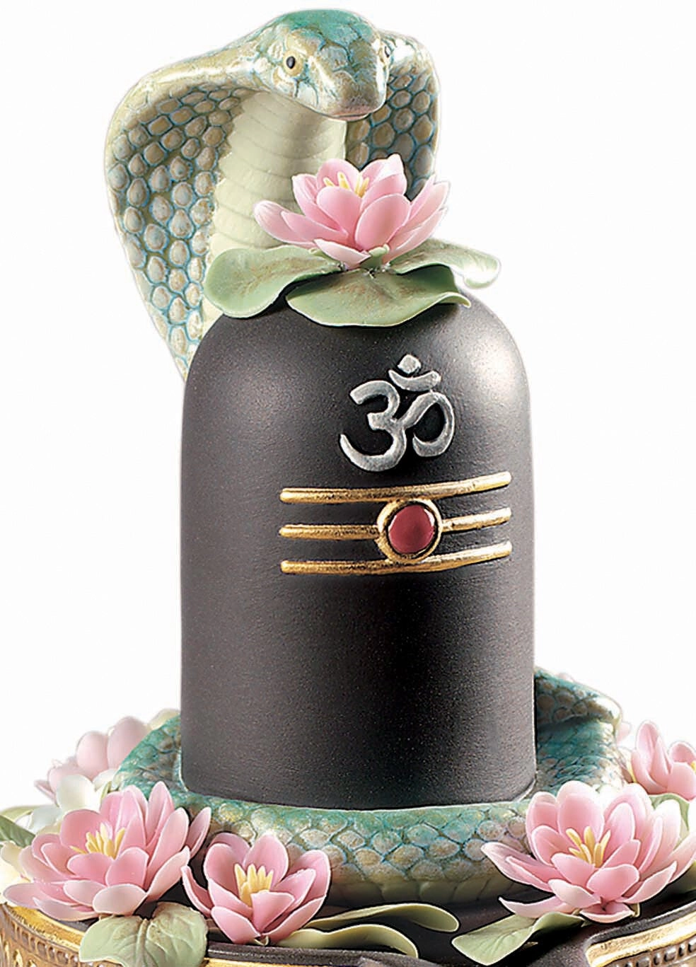 - Figurka Lingam w czarnym odcieniu ze złotym połyskiem i ręcznie robionymi kwiatami.
