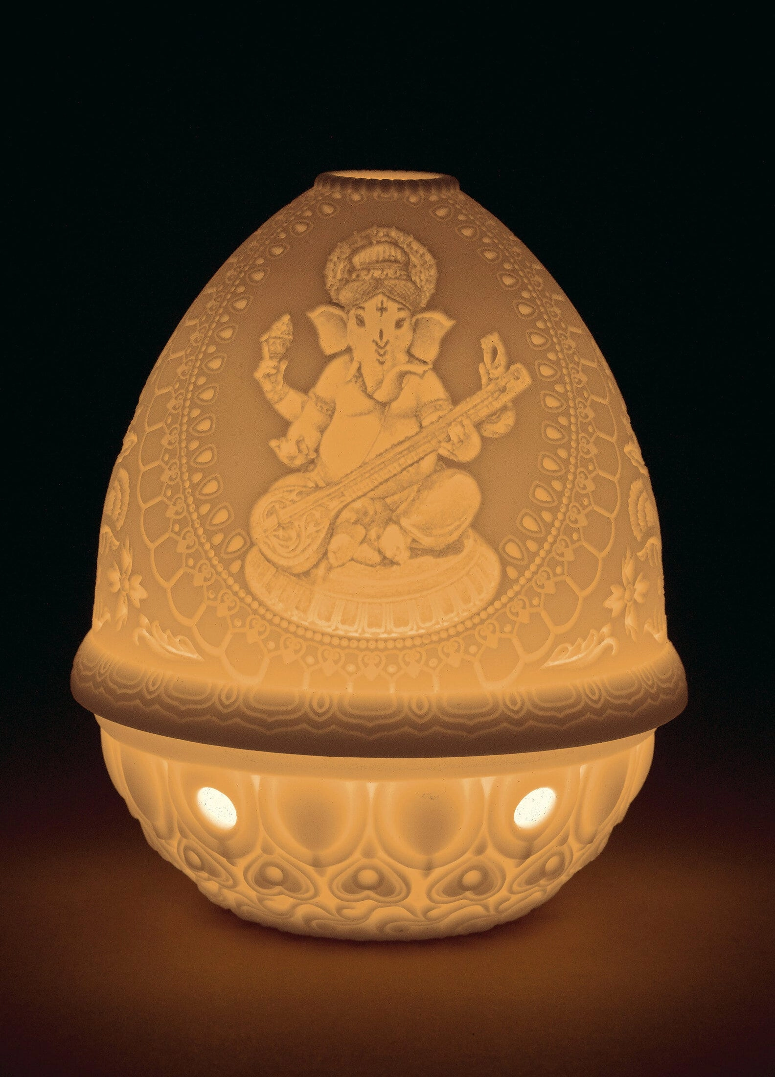 - Litofania z wewnętrznym światłem LED przedstawiająca Ganeshę trzymającego długą indyjską gitarę Veena.