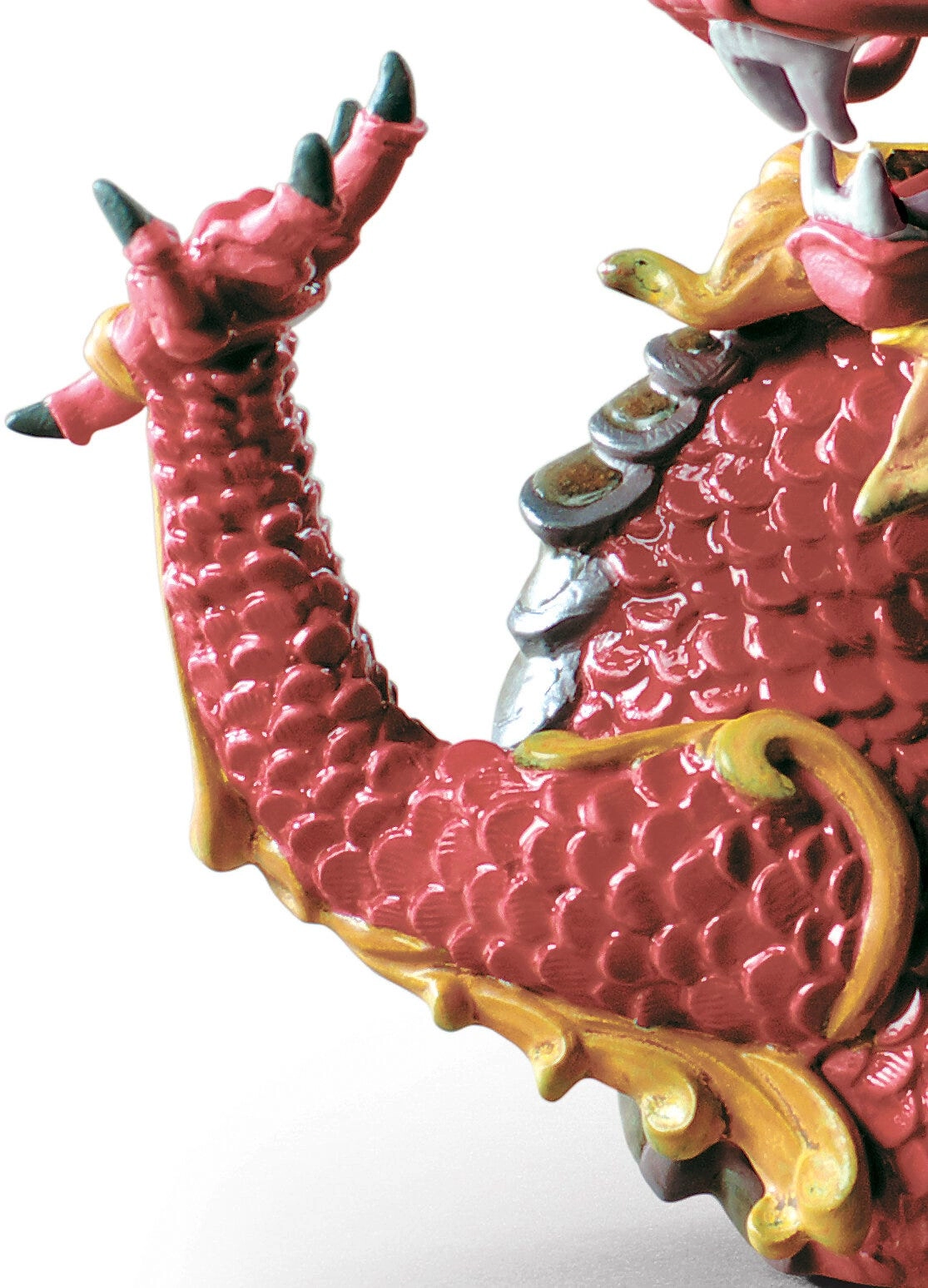 - Porcelanowa rzeźba czerwonego smoka z dodatkiem złotego połysku.