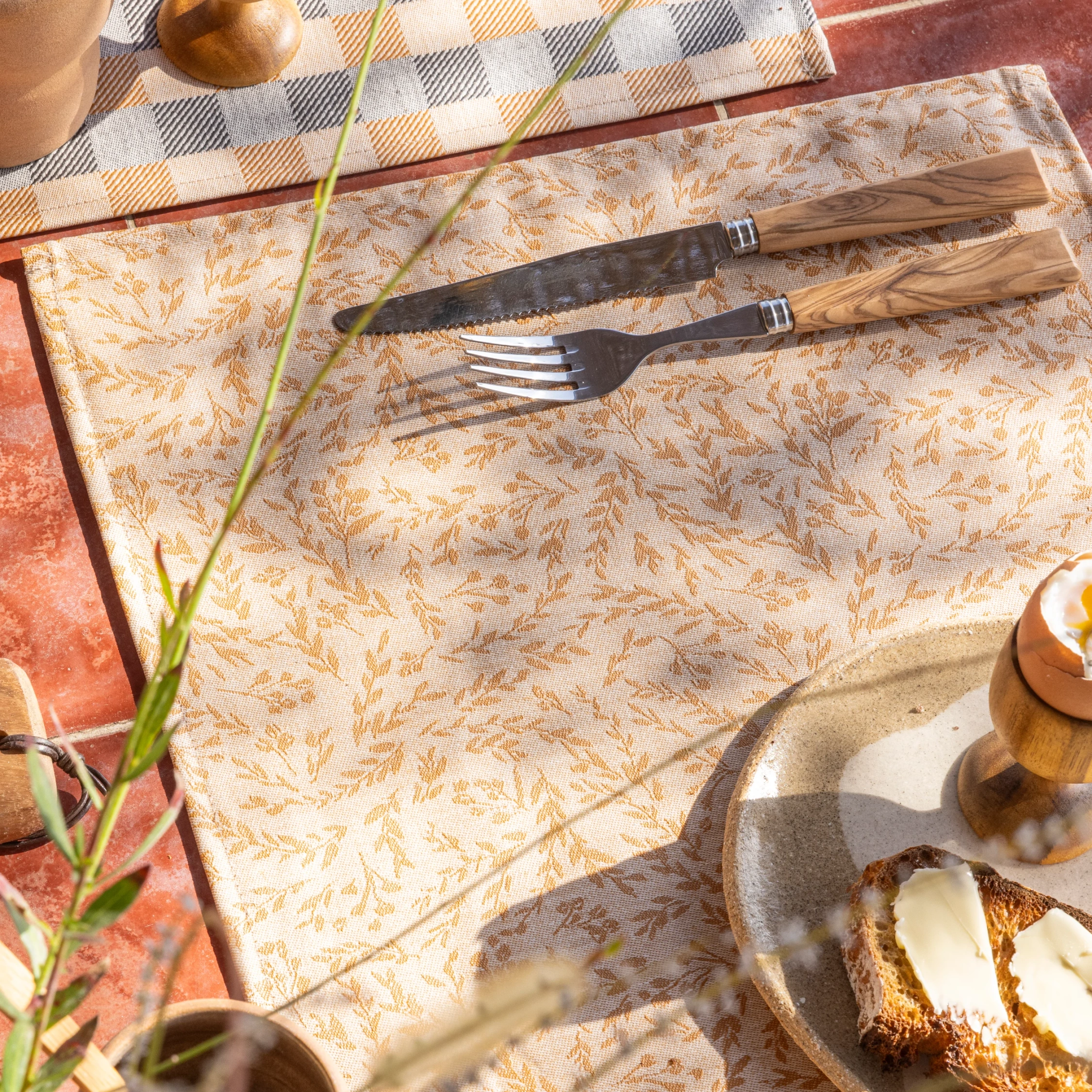• Mata stołowa plamoodporna 50 x 36 cm w kolorze beżowym z drobnym motywem roślinnym z kolekcji Champêtre od Le Jacquard Francais.