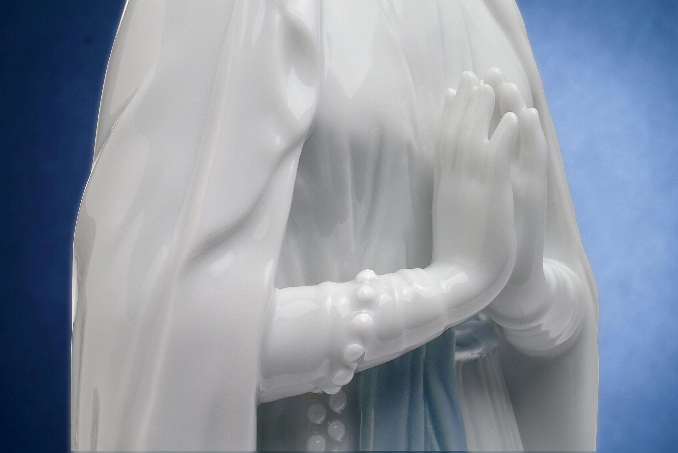 - Błyszcząca figurka Matki Boskiej z Lourdes z żółtymi kwiatami i różańcem.