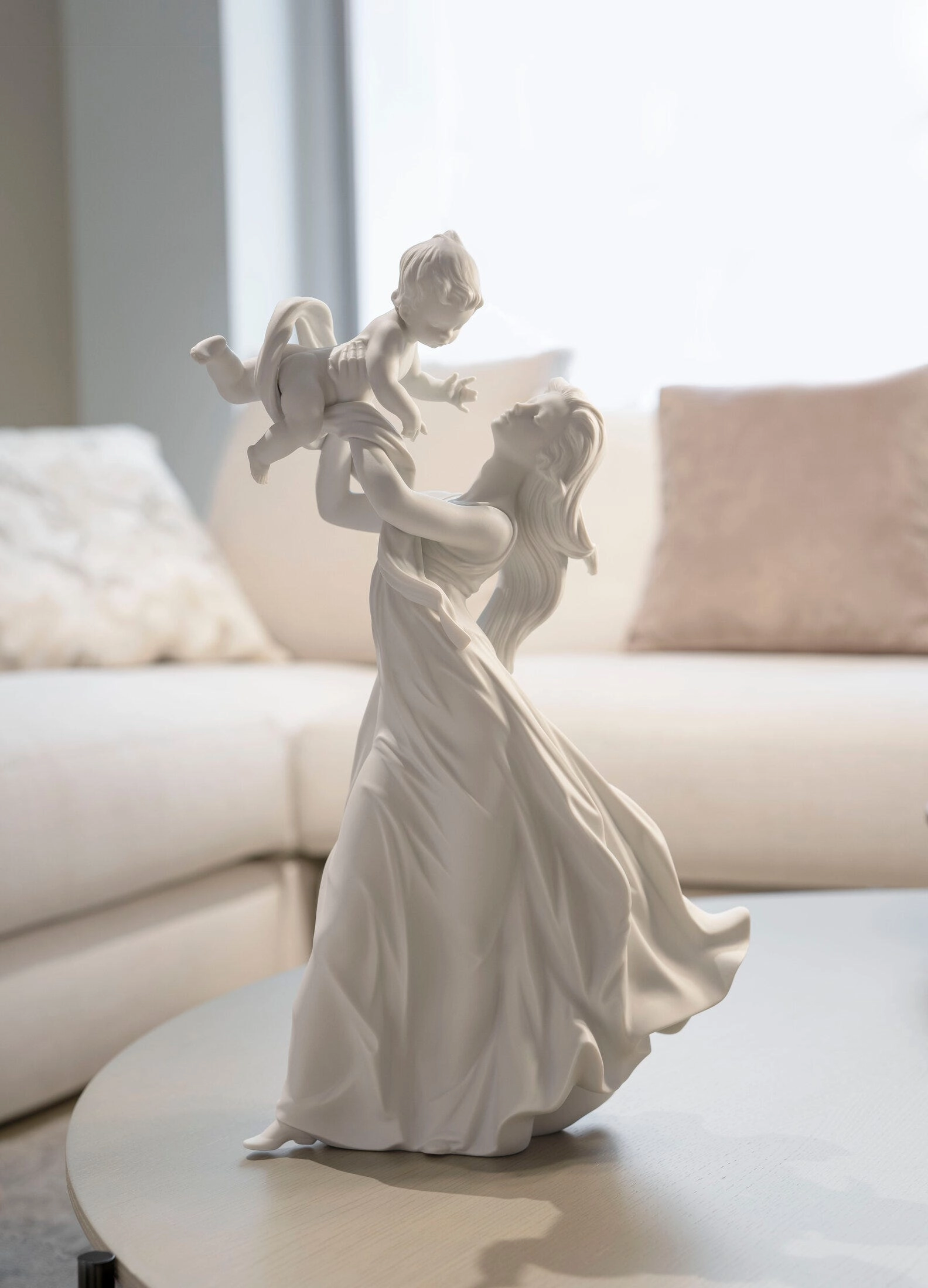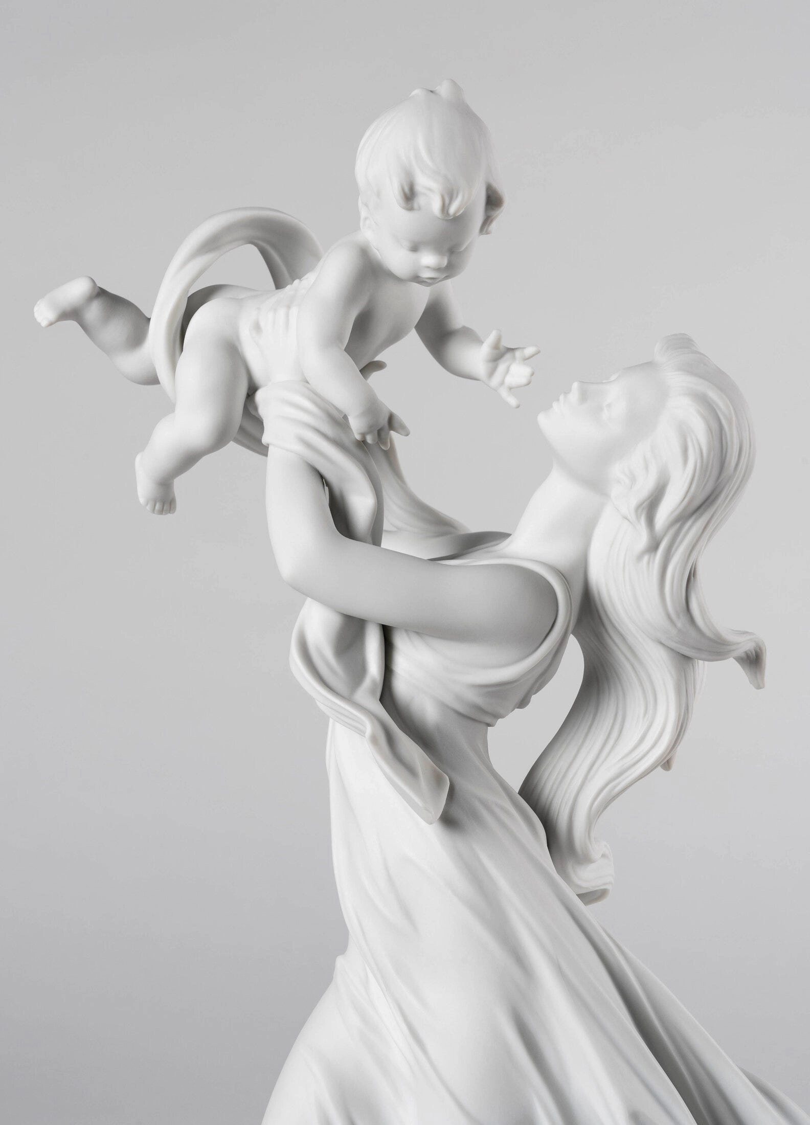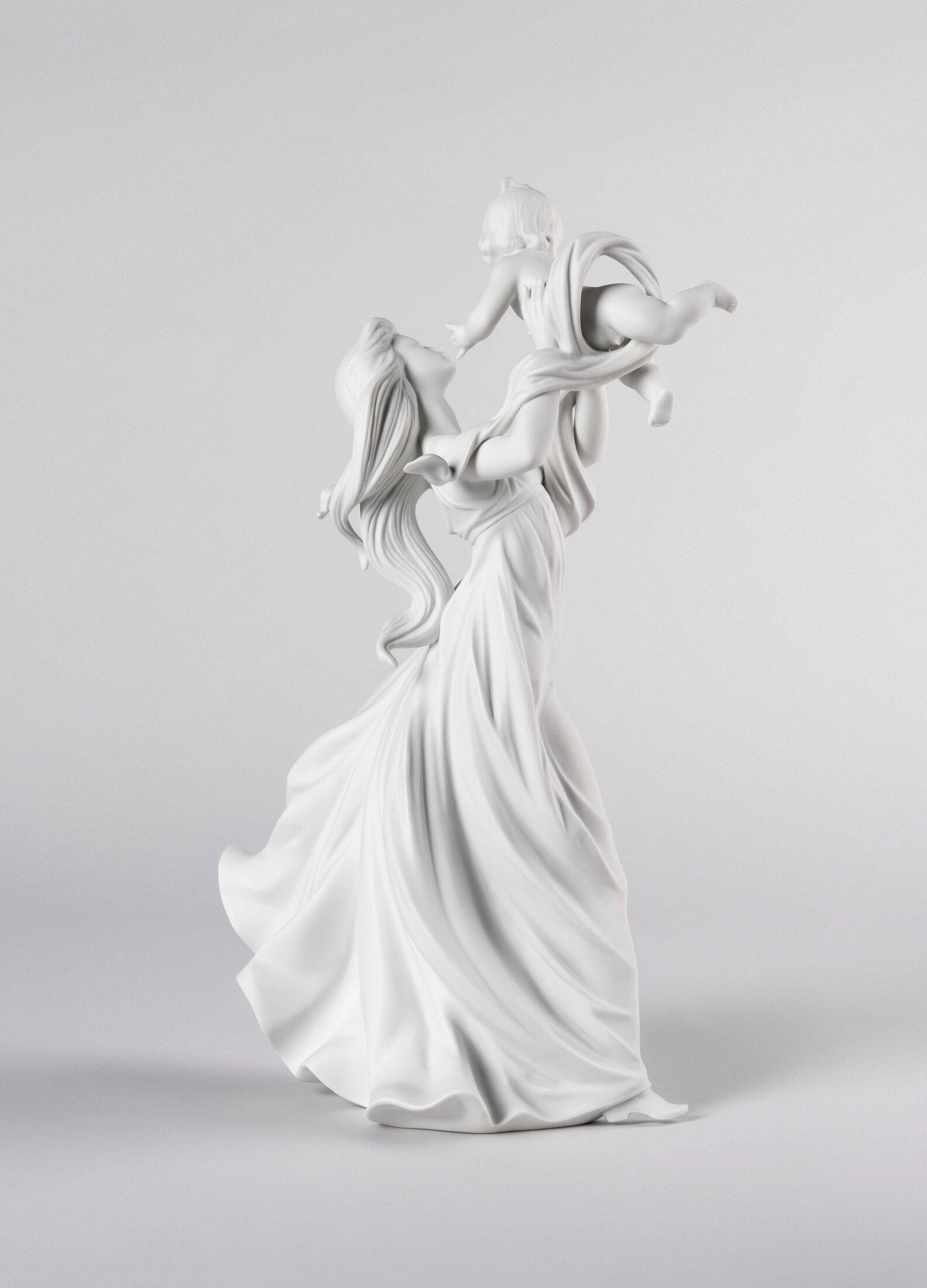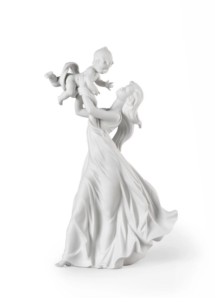 - Matowa porcelanowa figurka przedstawiająca matkę podnoszącą do góry swoje dziecko.
