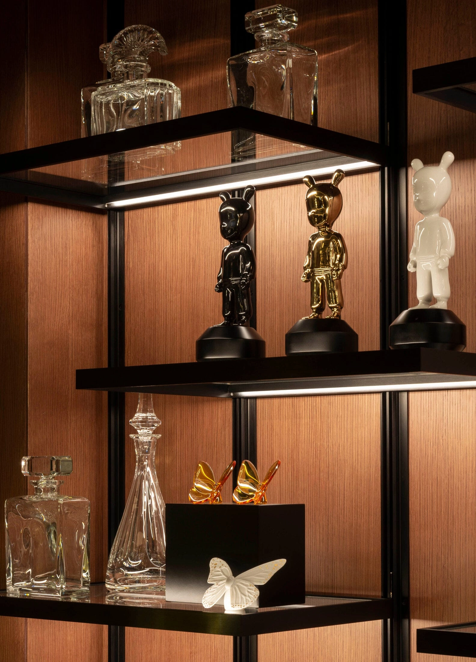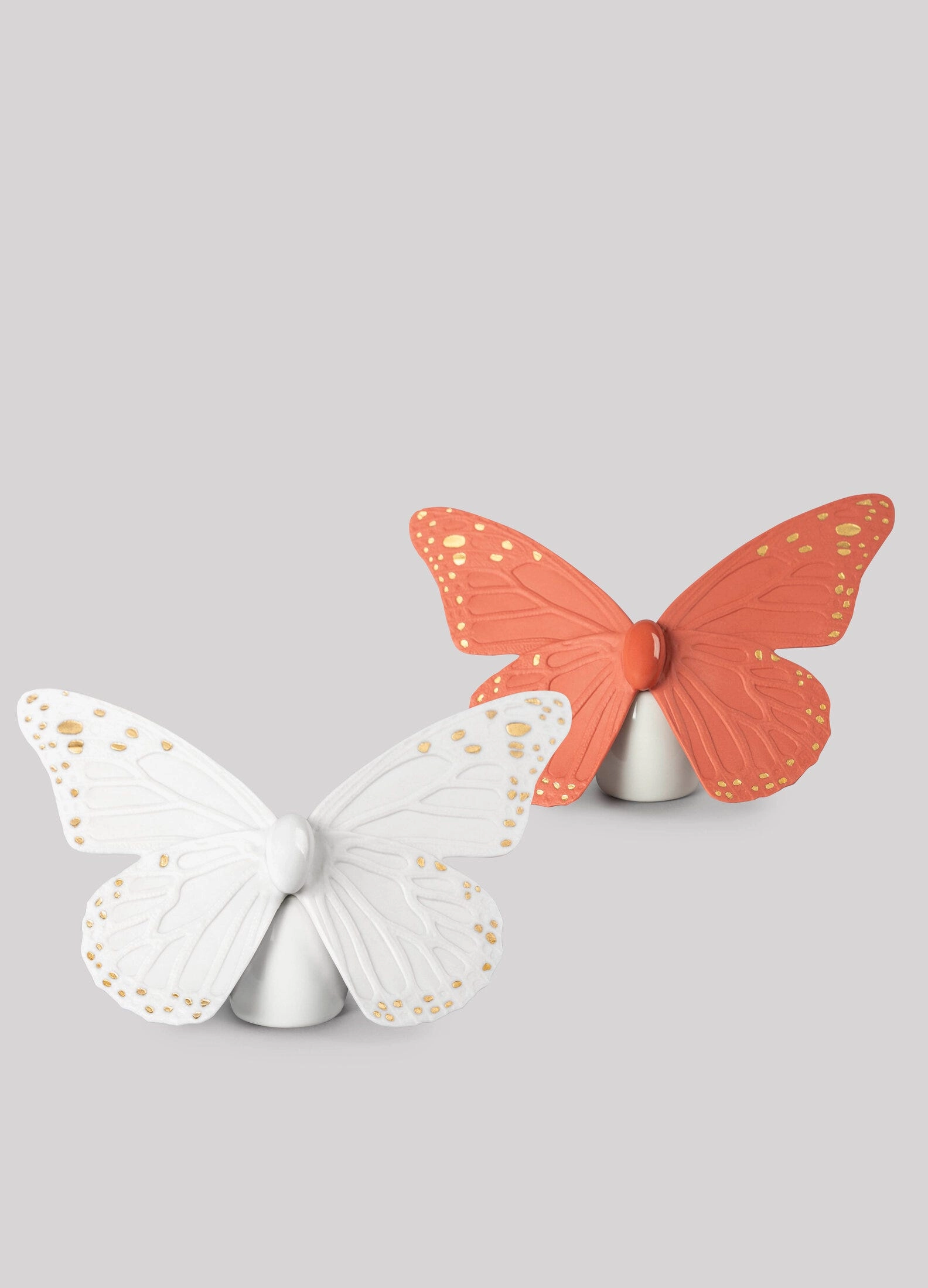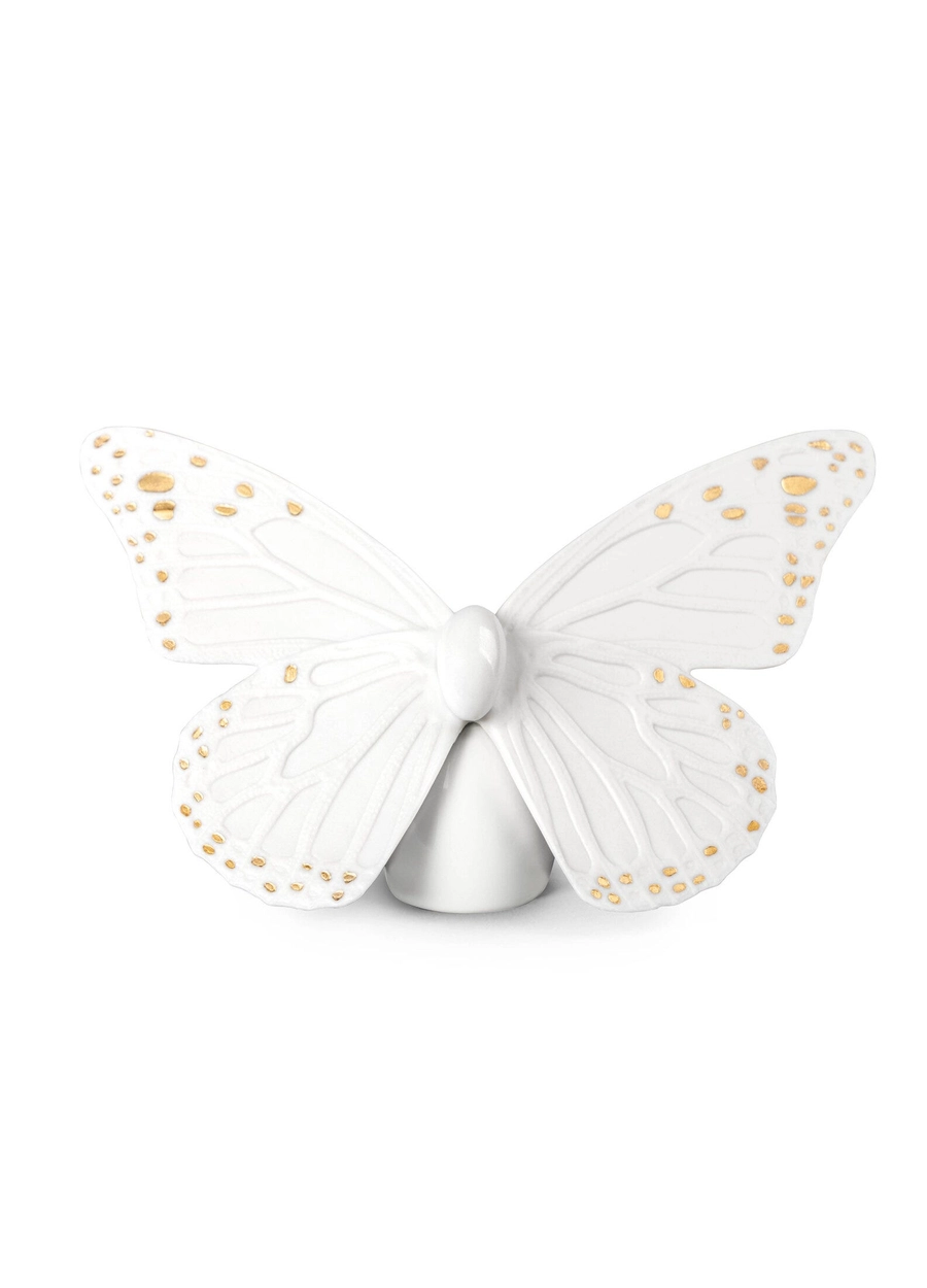 - Porcelanowy motyl w białym odcieniu z delikatnymi złotymi zdobieniami.