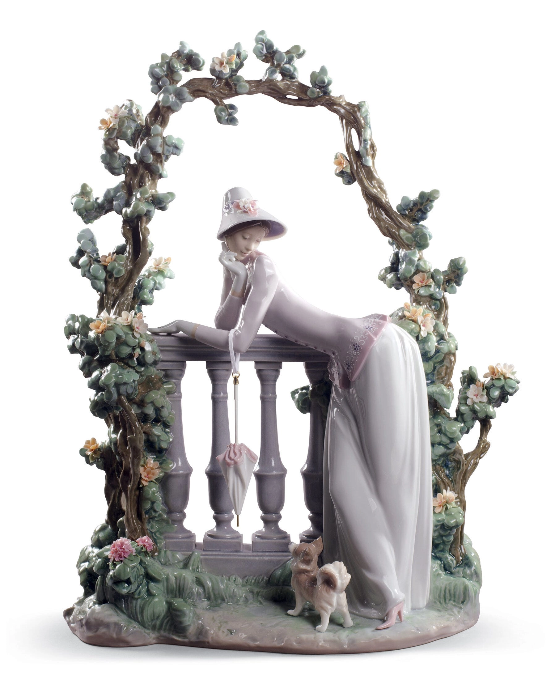- Rzeźba kobiety odpoczywającej na balustradzie wypełnionej kwiatami.