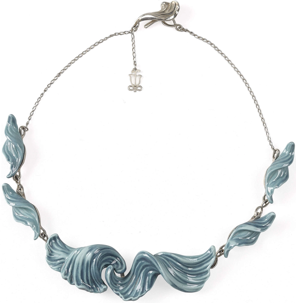 Oryginalny naszyjnik z porcelanowymi elementami stworzonymi na kształt fali. Wykonany ze srebra próby 925 z porcelaną i kolorowymi emaliami. Kolekcja Aquarium nawiązuje do głębi oraz tajemniczości morza i oceanów. Fascynujące ludzkość od wieków fale zostały zatrzymane w kawałkach biżuterii ozdobionych szlachetną porcelaną. Zachowano niesamowitą różnorodność i ułożenie fal przez zastosowanie odpowiednich faktur na każdym elemencie biżuterii. Zastosowanie emalii pozwala na uzyskanie świetlistej, dynamicznej i oryginalnej kompozycji. Doskonale sprawdzą się jako biżuteria dla współczesnej i poszukującej nietuzinkowych przedmiotów kobiety. Wykonane ręcznie w Walencji.