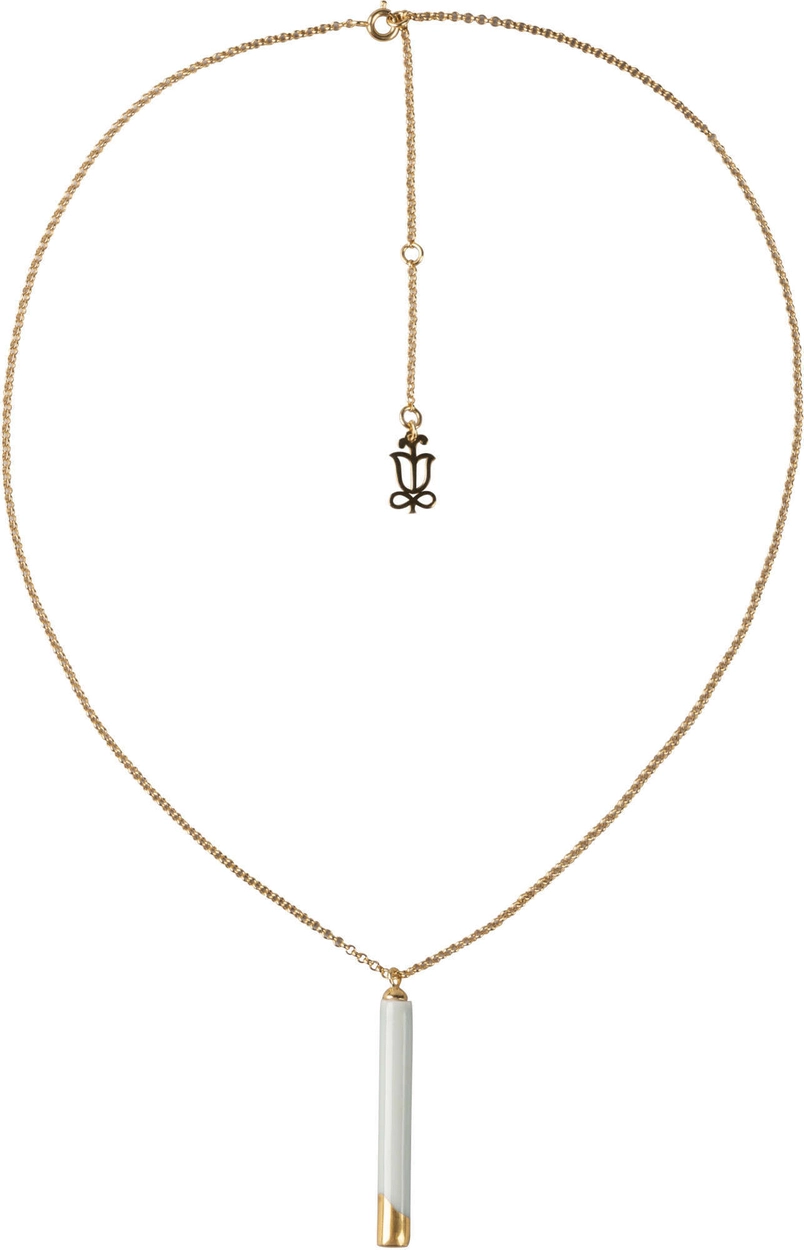 Delikatny łańcuszek z niebiesko-zieloną zawieszką wykonaną z porcelany i ozdobioną złotym połyskiem. Wykonany ze srebra próby 925 pozłacanego 18-karatowym złotem. Kolekcja Twiggy to czysta prostota i skromna elegancja! Piękno tych elementów ukazuje się w najprostszych formach, bez zbędnych dekoracji i wymyślnych kształtów. Tu króluje cylindryczna forma, złote dodatki i ledwo zauważalny kolor. Delikatna, lekka i naturalnie wyglądająca kolekcja charakteryzuje się połączeniem złota z delikatnymi niebiesko-zielonymi odcieniami. Doskonały pomysł na prezent dla poszukującej oryginalnych i współczesnych dodatków kobiety.