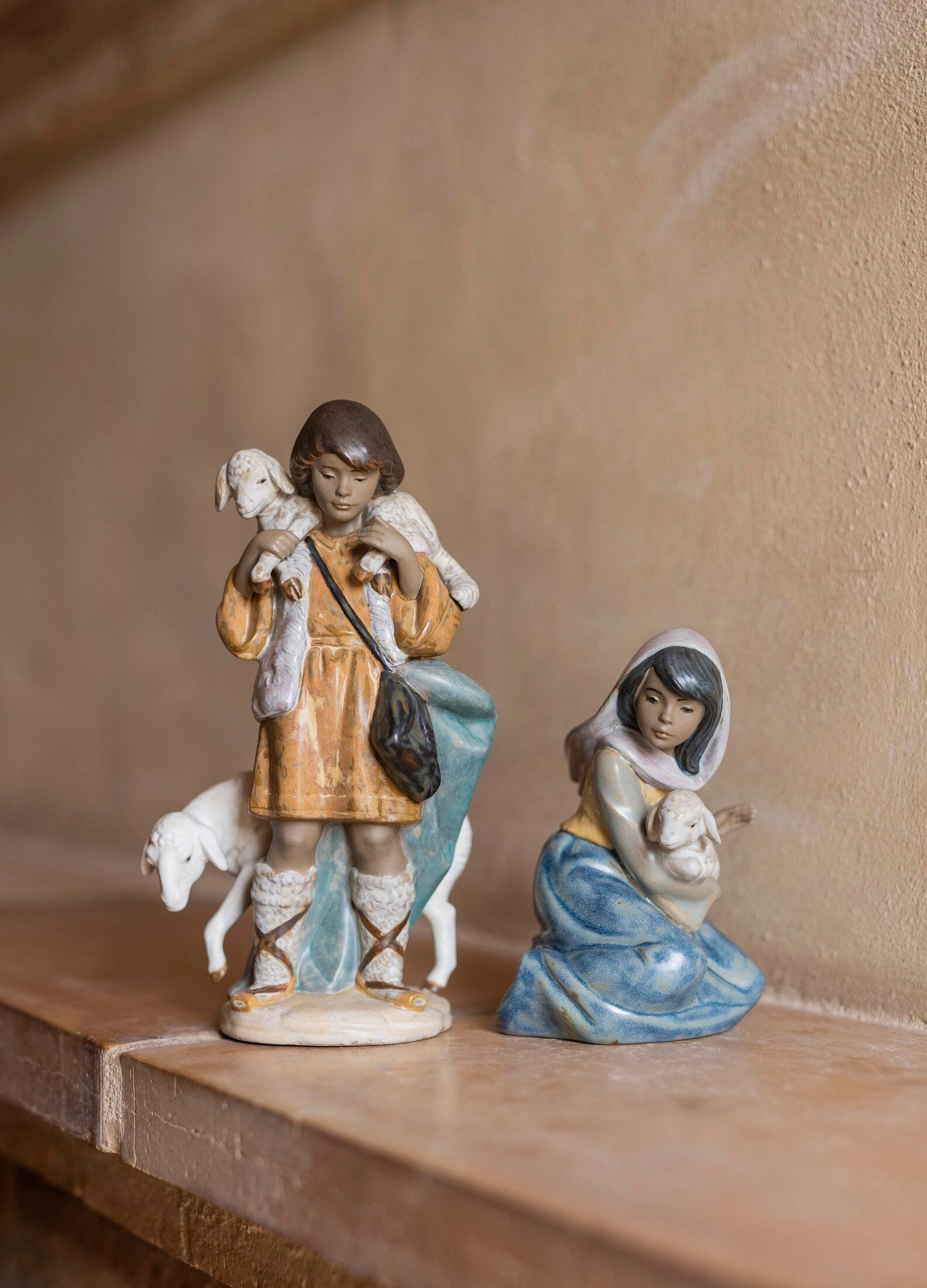 - Figurka pasterza z owcami wykonana z kamionki do szopki bożonarodzeniowej.