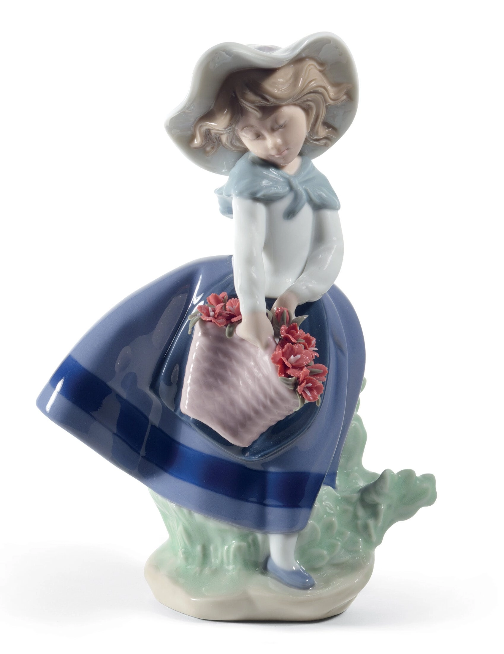 - Figurka dziewczynki z koszem pełnym czerwonych goździków.
