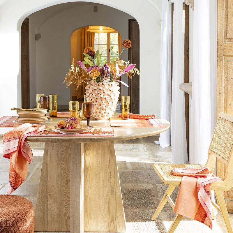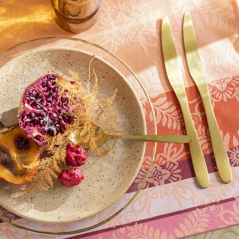 Bawełniana mata powlekana z kolekcji Mumbai Orange. Zewnętrzna warstwa akrylu chroni przez zabrudzeniami oraz wchłanianiem płynów. Umożliwia także szybkie czyszczenie przy użyciu delikatnej, wilgotnej gąbki. Dla optymalnego komfortu podkładki posiadają antypoślizgową powierzchnię, która uniemożliwia przesuwanie się podczas posiłku. Kolekcja Mumbai przeniesie Cię prosto do Indii, gdzie elegancja miesza się z duchowością, a praktyka łączy ze stylem... Daj się przenieść do serca Indii, gdzie znajdziesz stoły zastawione soczystymi ananasami, granatami, kwiatem lotosu i bujnymi liśćmi.