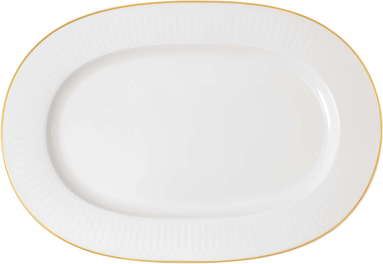 Półmis owalny z kolekcji Chateau Septfontaines. Kolekcja Chateau Septfontaines to najnowsza odsłona luksusowej serii Signature sygnowanej przez Villeroy&Boch. Nazwa nawiązuje do historycznej rezydencji wzniesionej przez braci Boch pod koniec XVII wieku. Podczas tworzenia tej kolekcji zainspirowano się ówcześnie królującym stylem klasycznym w nowej, subtelnej odsłonie w stylu art déco. Całość to efektowna gra między błyszczącą powierzchnią porcelany, matowym zdobieniem zaprojektowanym przez samego Vileroy&Boch oraz 20-karatowym złotem znajdującym się na brzegach. Połączenie wysokiej jakości porcelany oraz najnowszych technik dekorowania sprawia, że całość jest niezwykle efektowna, czarująca, a jednocześnie nadająca się do codziennego użytku - doskonała dla koneserów porcelany na najwyższym poziomie.