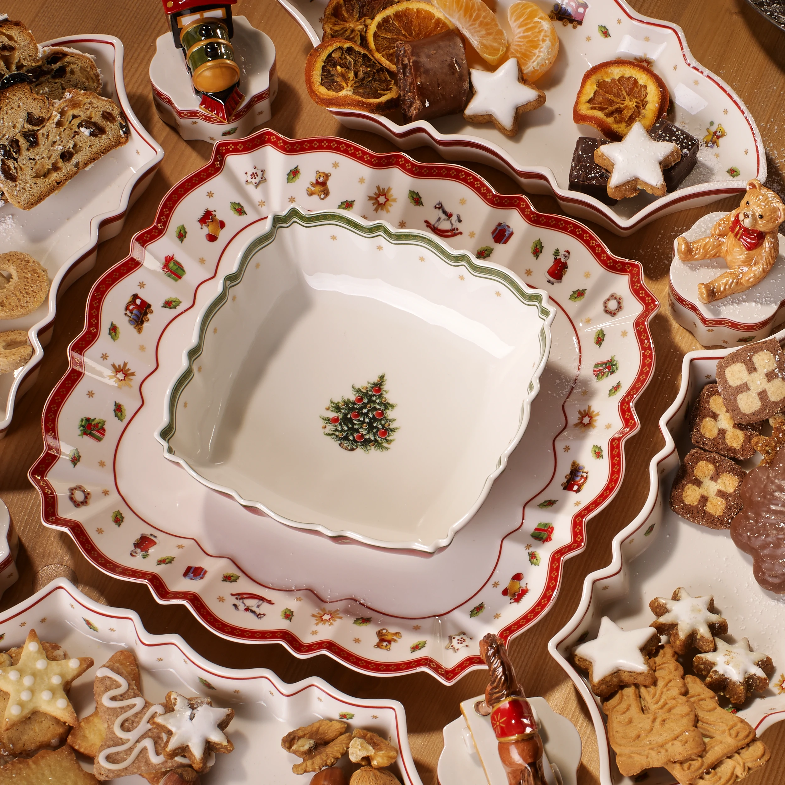 Półmisek z kolekcji Toy's Delight. Kolekcja z Villeroy & Boch Toy's Delight Christmas obejmuje szeroki asortyment świątecznych naczyń na wigilijny stół. Różne części serwisowe są ozdobione motywami dającymi przedsmak Bożego Narodzenia. Zapraszamy na bajkową, sentymentalną podróż! Za sprawą kolekcji przygotowanych na Boże Narodzenie. Na nowo przeniesiesz się do krainy fantazji i w czas beztroski. kolekcja porcelany udekorowana świątecznymi zabawkami: Mikołaj, lokomotywa, miś, skarpeta na prezenty.