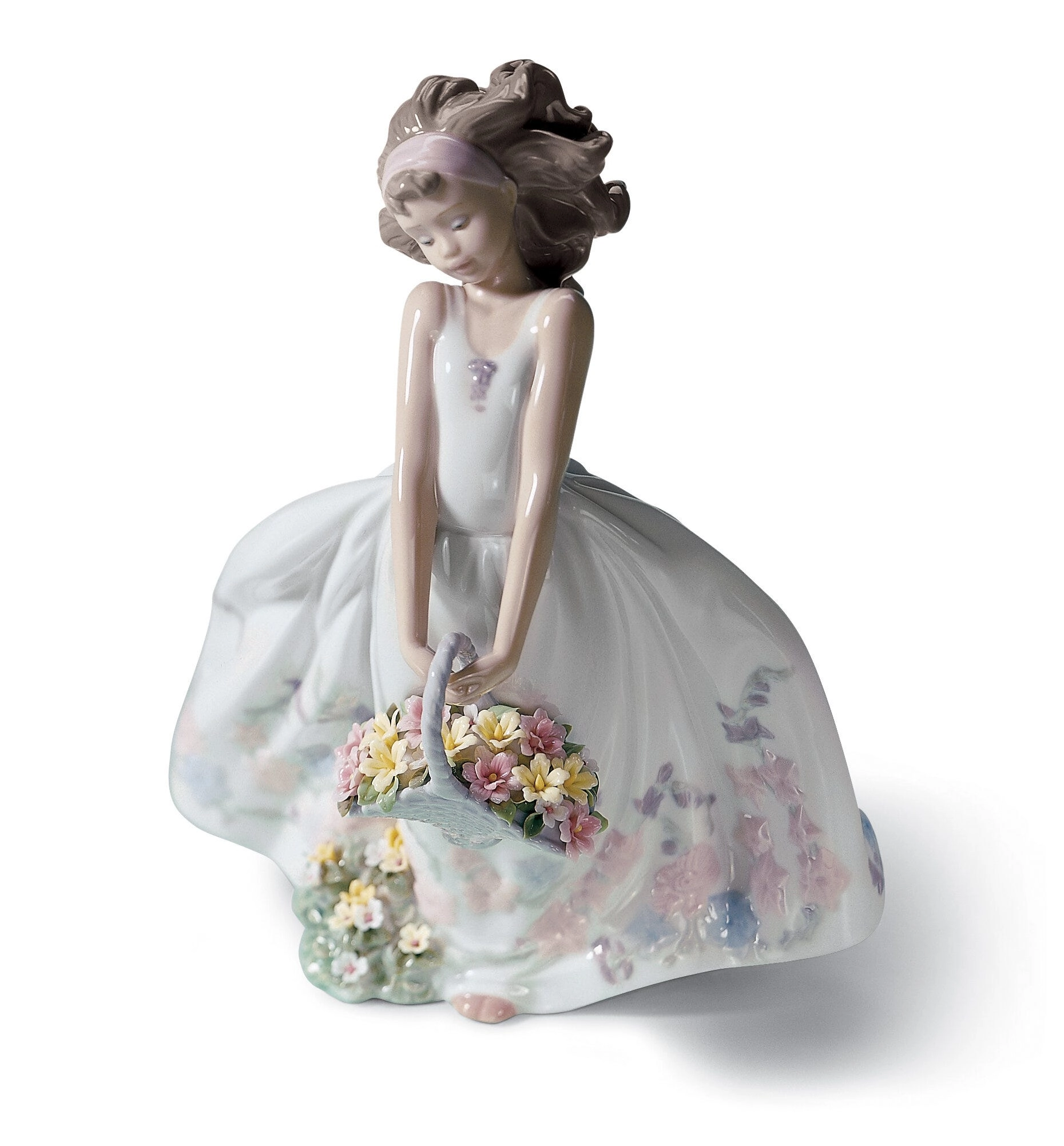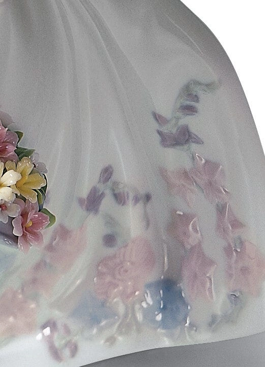 Od pięknego kwiatowego nadruku sukienki po kwiaty w koszu i ukryte pod spódnicą - wszystko w tej figurce emanuje kwiatowym urokiem i radością z nadchodzącej wiosny. Błyszcząca porcelanowa figurka "Wild Flowers" została ozdobiona klasyczną paletą pastelowych kolorów Lladró. Całość dopełnia efektowna sukienka, która zachwyca delikatnością i wygląda jakby układał ją wiosenny wiatr. To idealny pomysł na prezent, jako element kolekcji lub dekoracja do Twojego wnętrza.