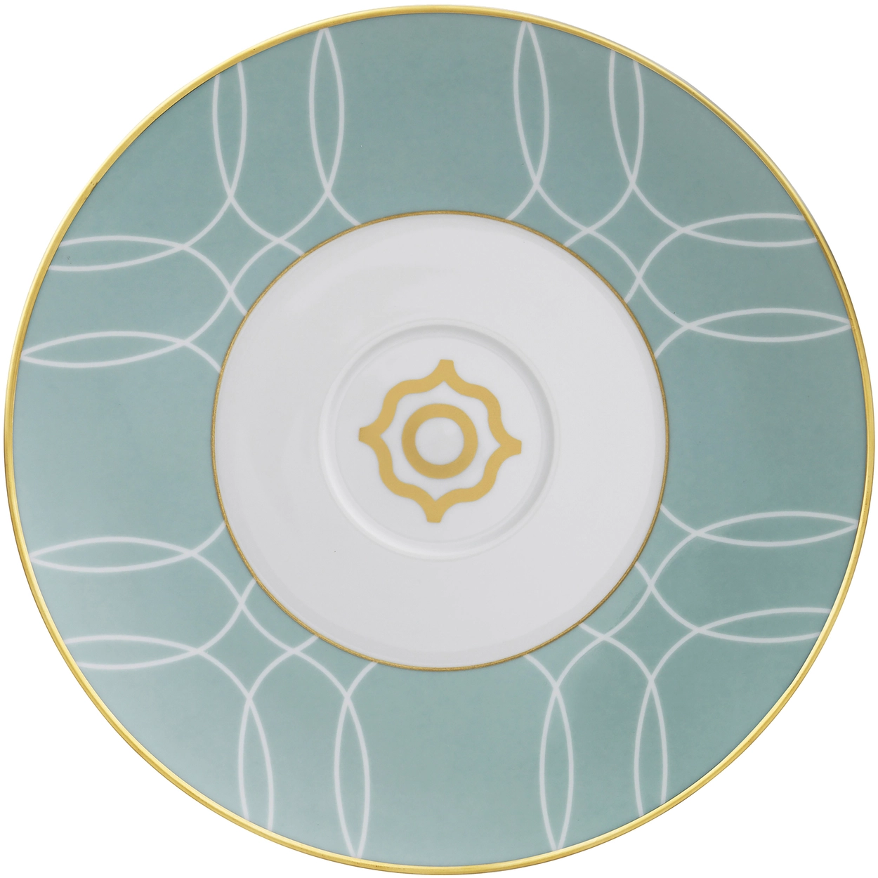 Turkusowo-zielony spodek do bulionówki o średnicy 21cm z pozłacanymi dodatkami z kolekcji CARLO ESTE. CARLO ESTE to artystyczna i szlachetna kolekcja, która zachwyca luksusowymi odcieniami złota, subtelnych zieleni i niezwykłymi zdobieniami. Wrażenie na nakrytym stole przypomina artystyczne mozaiki, gdzie delikatne porcelanowe elementy doskonale współgrają z nowoczesnym stylem życia. Porcelana premium ESTE to nie tylko zwykłe naczynia, ale także wyjątkowe dzieła sztuki, które nadają elegancji każdej okazji. Zestaw ESTE to idealna propozycja dla tych, którzy cenią artystyczny design i wysoką jakość wykonania.
