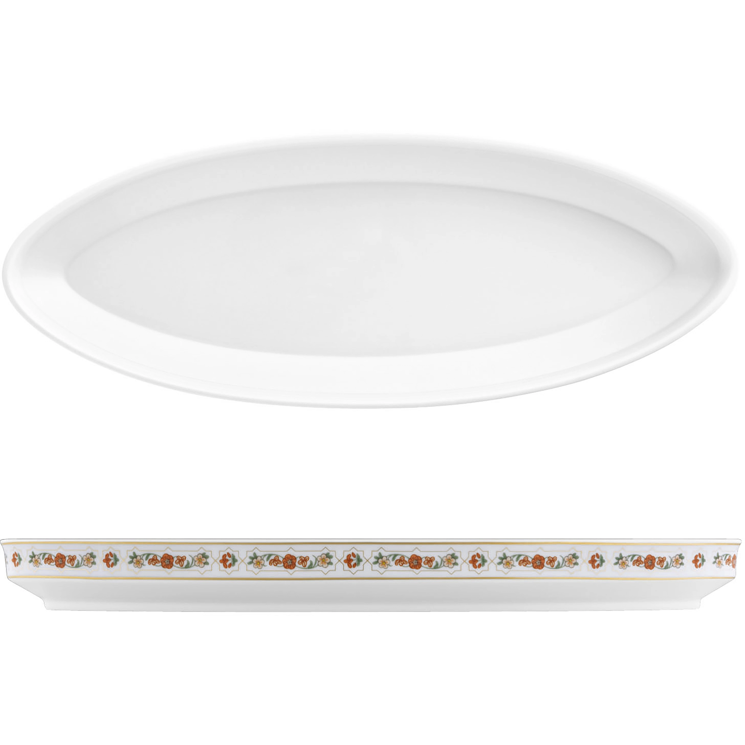 Talerz owalny o długości 31.4cm z dekorowanym brzegiem z kolekcji CARLO RAJASTHAN. RAJASTHAN to zmysłowa podróż do Starożytnego Orientu, inspirowana orientalnymi formami, barwami indyjskich sari i złotymi kratami architektury świątynnej Radżastanu. Bizantyjskie wzory kwiatowe oraz tekstylne ozdoby z XVI wieku tworzą wyjątkowy charakter tej kolekcji. Wzór RAJASTHAN powstał we współpracy z projektantem Peterem Kempe. Odkryj ekskluzywną porcelanę premium, która przeniesie Cię w magiczną atmosferę orientalnych inspiracji.