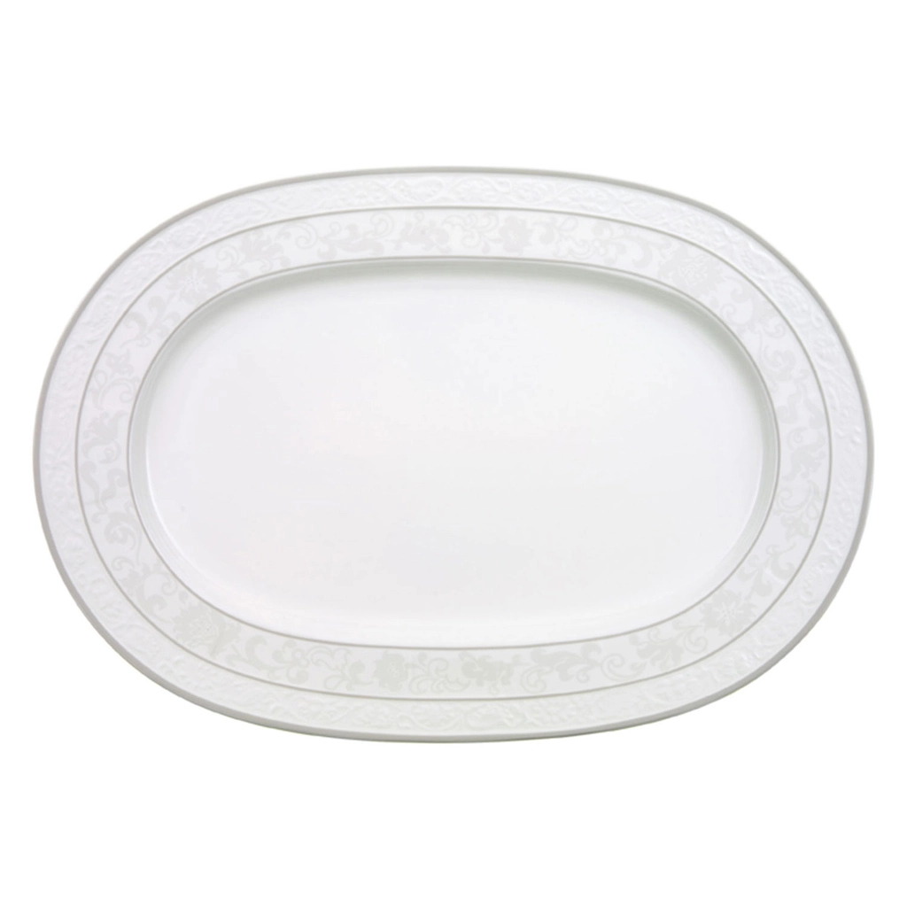 Półmis owalny 41 cm z kolekcji Gray Pearl. Kolekcja Gray Pearl to połączenie najwyższej jakości białej porcelany kostnej z delikatnie wypukłym srebrnoszarym dekorem i szarą lamówką. Motywy kwiatów i roślin idealnie współgrają z błyszczącą porcelaną tworząc jedność i nadając całej zastawie wyjątkowej elegancji i szlachetności.  Klasyczny kształt sprawdzi się przy każdej uroczystości dodając jej niezwyłego uroku. Zaaranżuj najpiękniejsze chwile z bliskimi z zastawą Gray Pearl!
