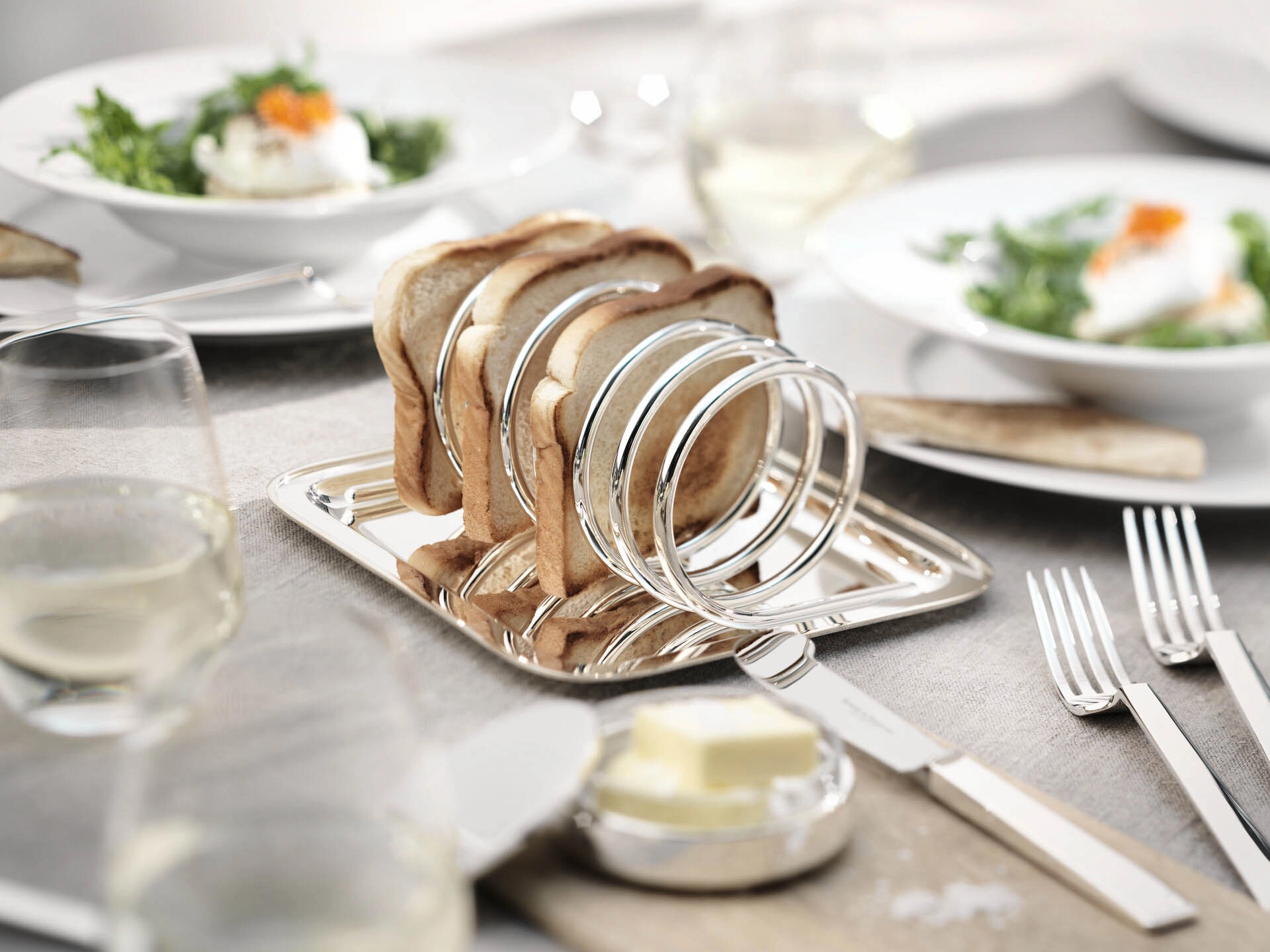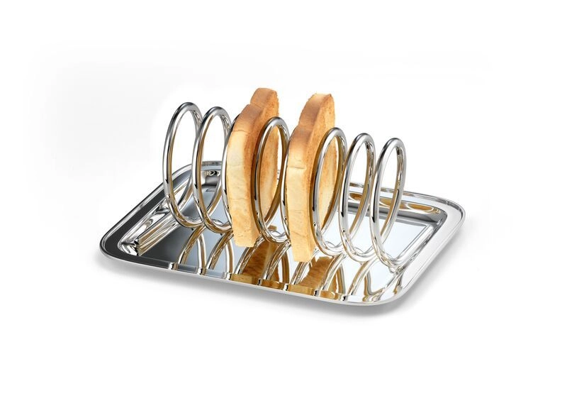 Posrebrzana taca do serwowania o wymiarach 17 x 21cm. Doskonale sprawdzi się do serwowania tostów - istnieje możliwość dokupienia specjalnego stojaka na tosty, ale także do podawania różnego rodzaju przekąsek, napojów czy tworzenia kompozycji kwiatowych. Wszystko niesione czy podane na niej zachwyca srebrnym połyskiem rozświetlającym otoczenie.