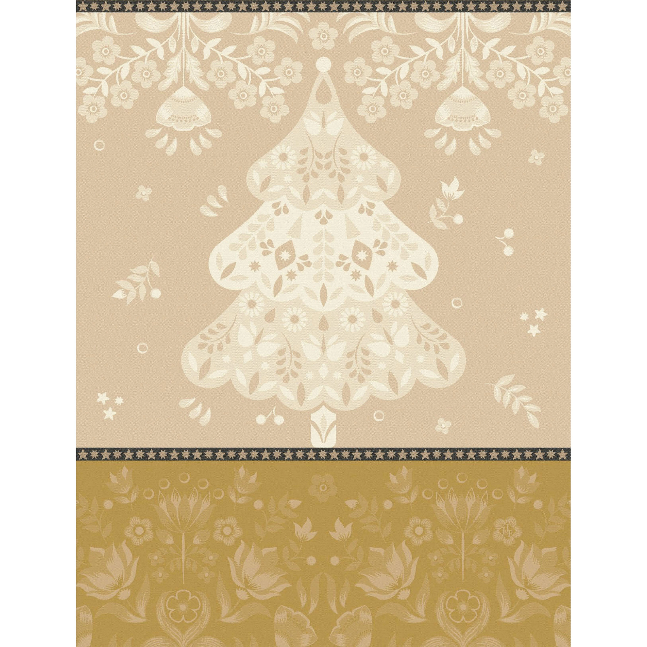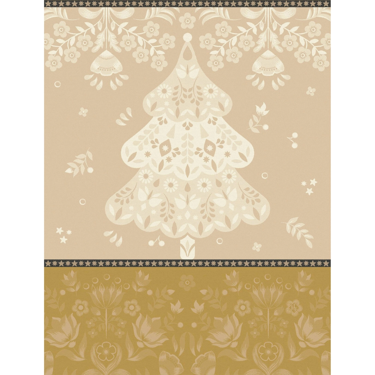 Bawełniany ręcznik herbaciany 60 x 80 cm w kolorze beżowym z kolekcji Féerie od Le Jacquard Francais. Poczuj świąteczny nastrój w folklorystycznym stylu. Motywy malowanych kwiatów subtelnie układają się w finezyjne wieńce i girlandy, a wśród nich połyskują choinki, gwiazdy i bombki, wprowadzając lekki blask do wnętrza. Każdy element tej kolekcji łączy w sobie elegancję rękodzieła z przytulnością zimowych wieczorów, tworząc wyjątkową oprawę stołu, która zachwyci gości i dopełni magii Świąt.