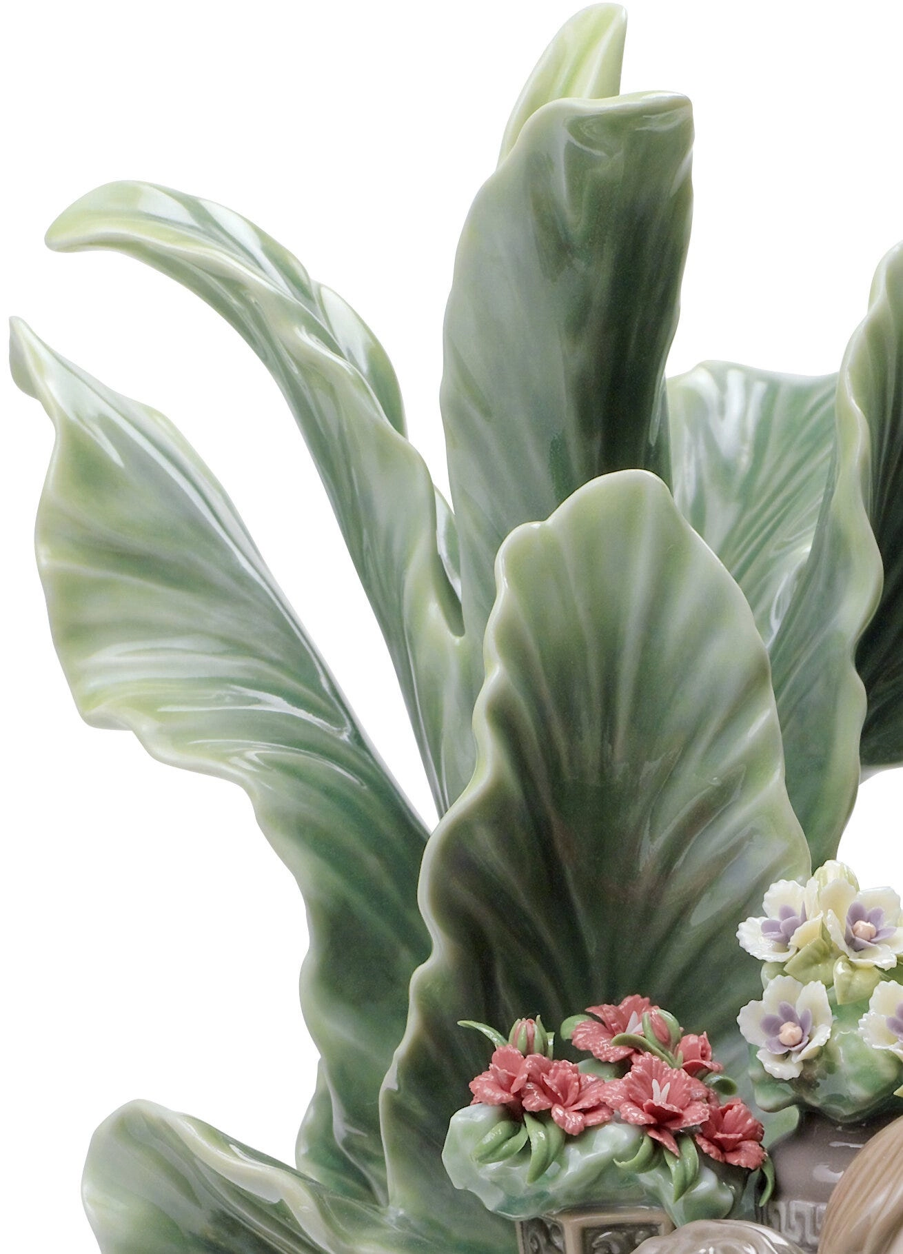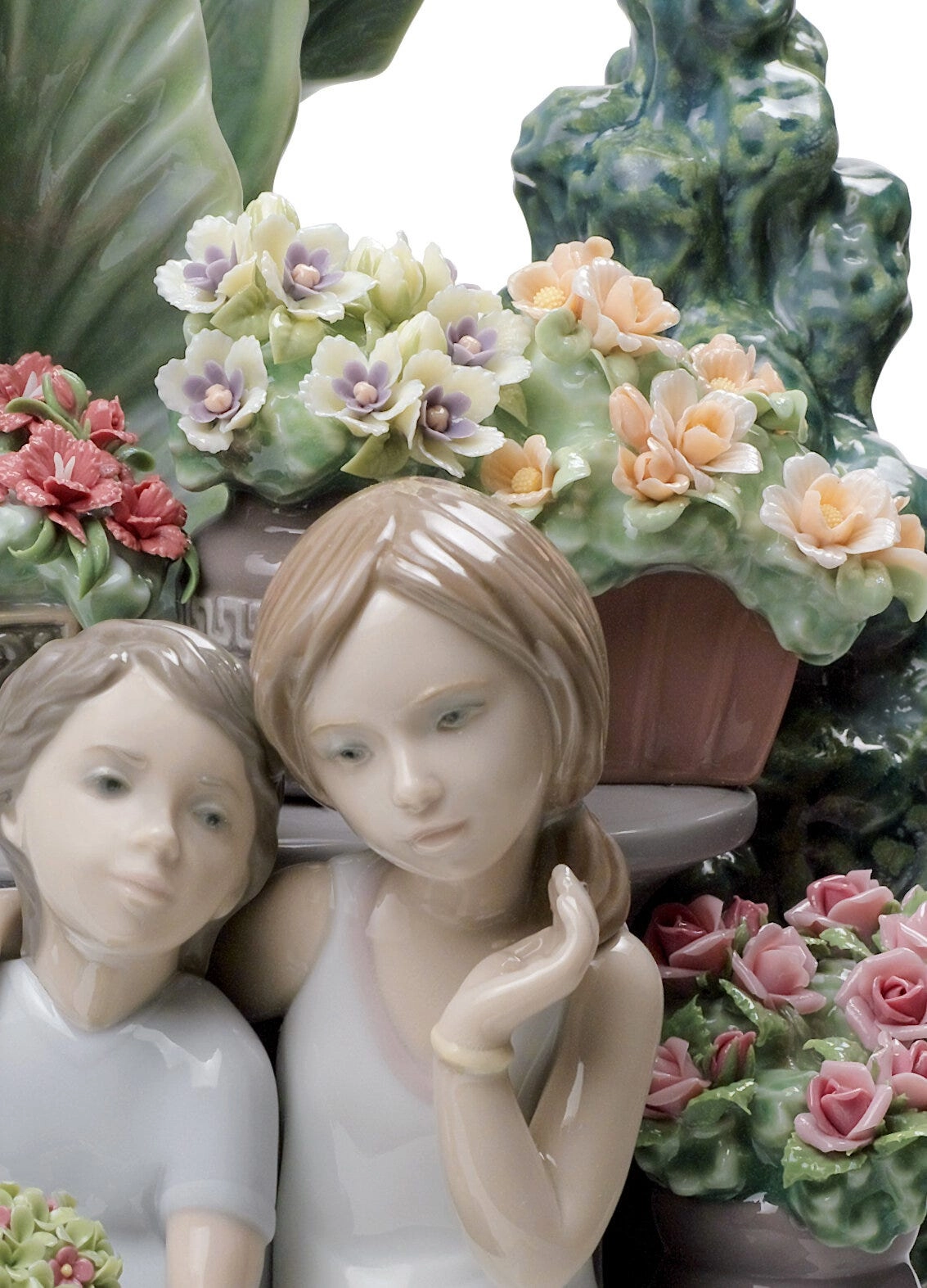 - Porcelanowa figurka przedstawiająca rodzeństwo siedzące na ławce w otoczeniu kwiatów.