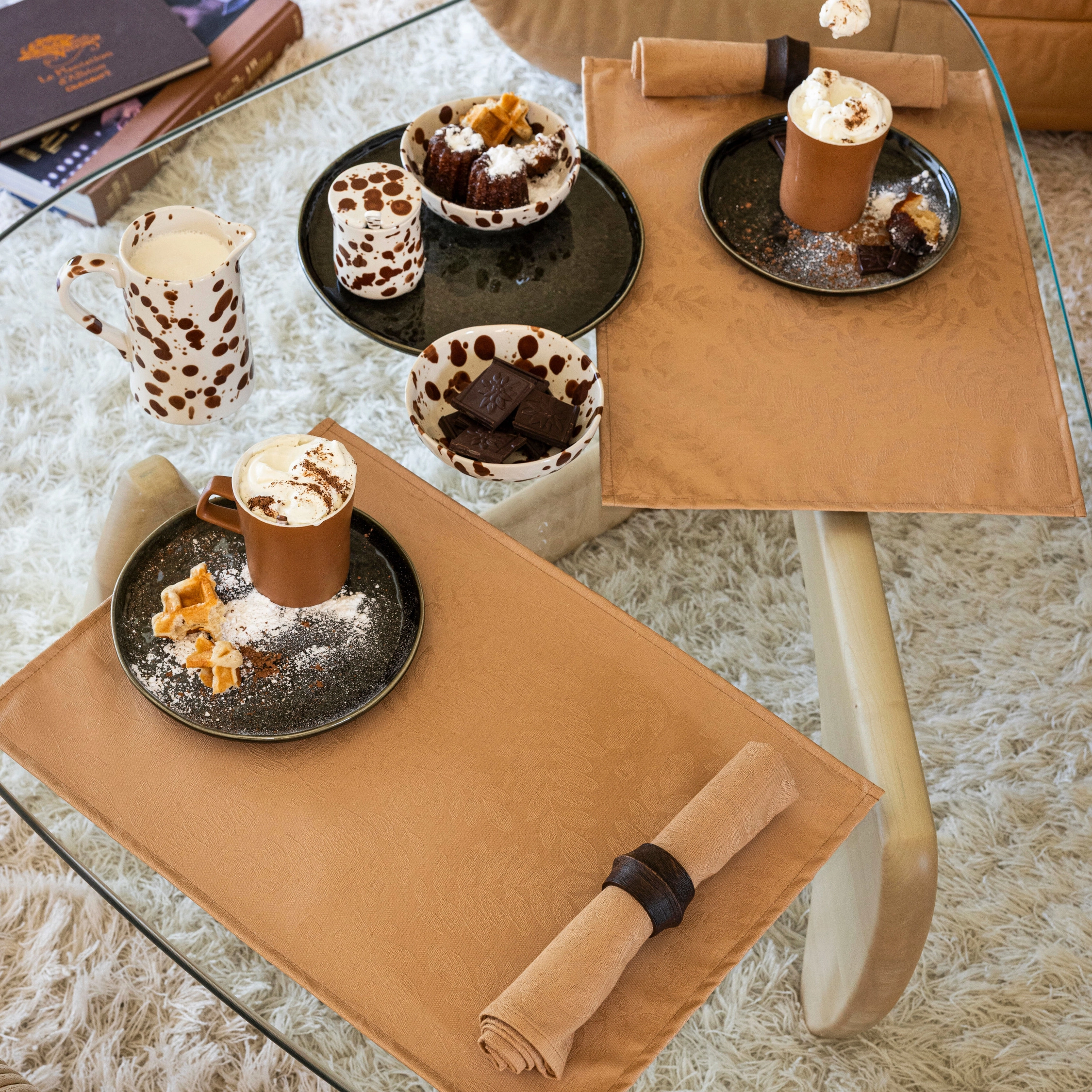Bawełniana serwetka w kolorze brązowym z kolekcji Vegetal Mood od Le Jacquard Francais. Kolekcja inspirowana ogrodami - przenieś swój stół w świat pełen roślinności i naturalnego wdzięku. Subtelne motywy roślinne, od smukłych gałązek po finezyjne liście akacji, tworzą harmonijną kompozycję, w której przeplatają się z głębokimi i nasyconymi barwami. Delikatna faktura tkaniny dodaje całości lekkości, a nowoczesny charakter wzoru sprawia, że aranżacja jest zarówno elegancka, jak i swobodna – idealna na codzienne posiłki oraz wyjątkowe okazje.