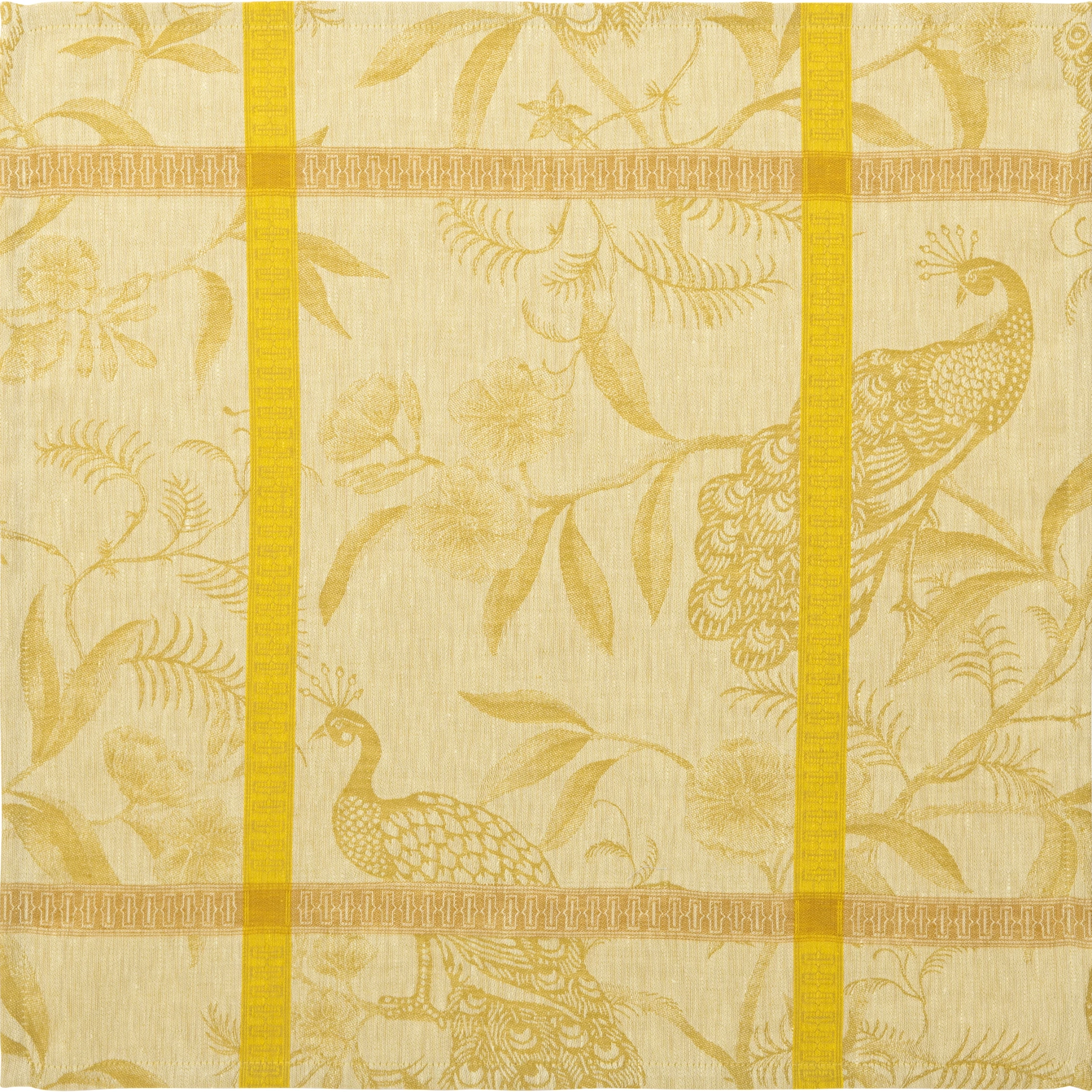 Lniany serwetka stołowa 55 x 55 cm w kolorze żółtym z kolekcji À l'orangerie od Le Jacquard Francais. Kolekcja À l'orangerie przenosi nas do francuskiego ogrodu wypełnionego kwiatami, gałęziami i pięknymi pawiami, które od wieków są symbolem elegancji. Egzotyczna, wykwintna i niezwykle elegancka kolekcji obrusów, bieżników, podkładek i serwetek, które są wykonane z europejskiego lnu. Dzięki wysokiej jakości użytych do produkcji przędzy obrusy są łatwe do prasowania oraz zachowują swój kształt i kolor przez wiele lat. Seria dostępna w trzech kolorach - niebieski, zielony i żółty.