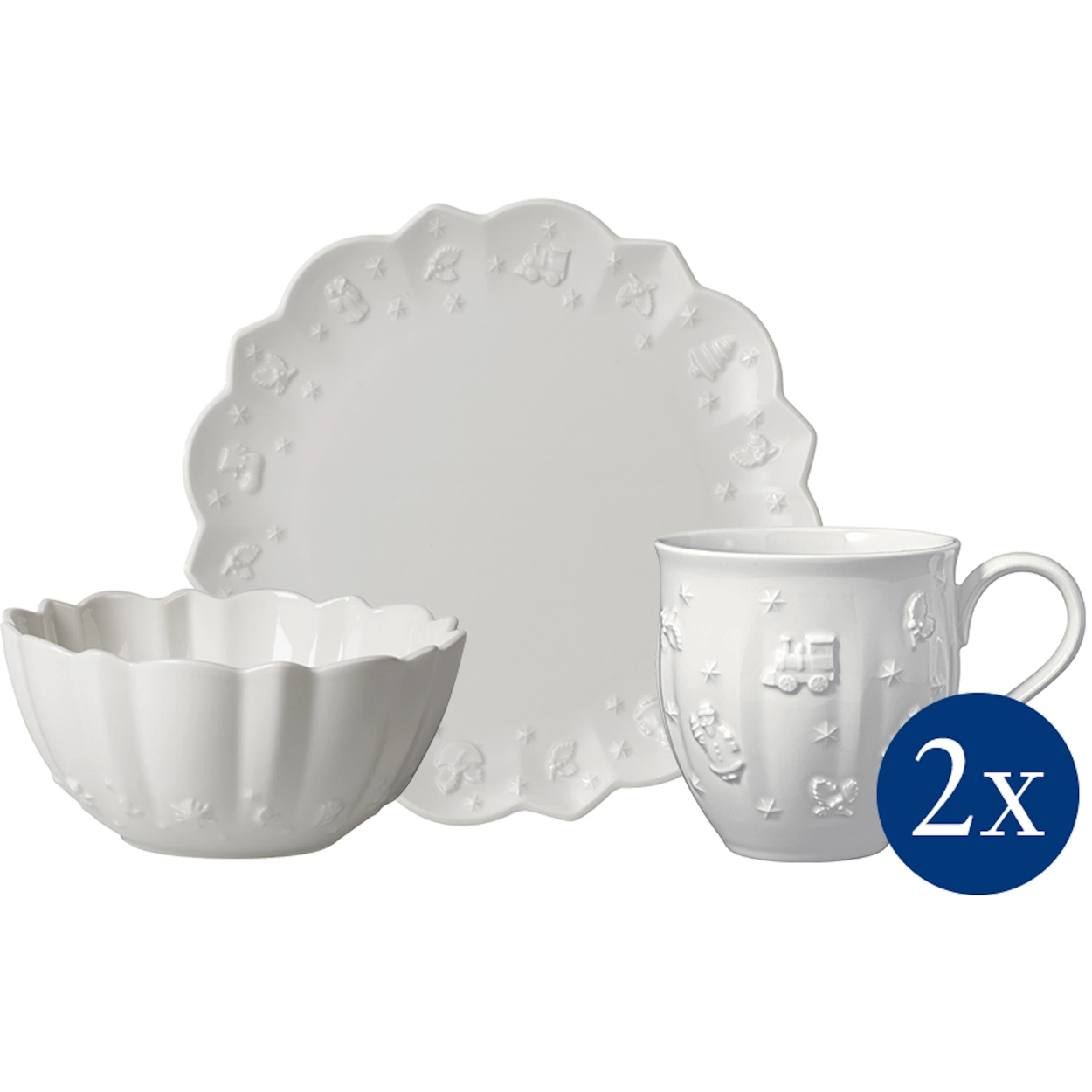 Zestaw śniadaniowy dla dwóch osób ze świątecznej kolekcji porcelany Toy's Delight Royal Classic od Villeroy & Boch. W skład zestawu wchodzą dwa talerze śniadaniowe (23 cm), dwie miseczki (ok. 330 ml) oraz dwa kubki (ok. 250 ml). Seria Toy's Delight Royal Classic zachwyca elegancją i minimalizmem... Biała porcelana została subtelnie ozdobiona reliefowymi motywami zabawek na brzegach i charakterystycznym kształtem. Doskonale komponuje się samodzielnie oraz w połączeniu z klasyczną zastawą Toy's Delight.