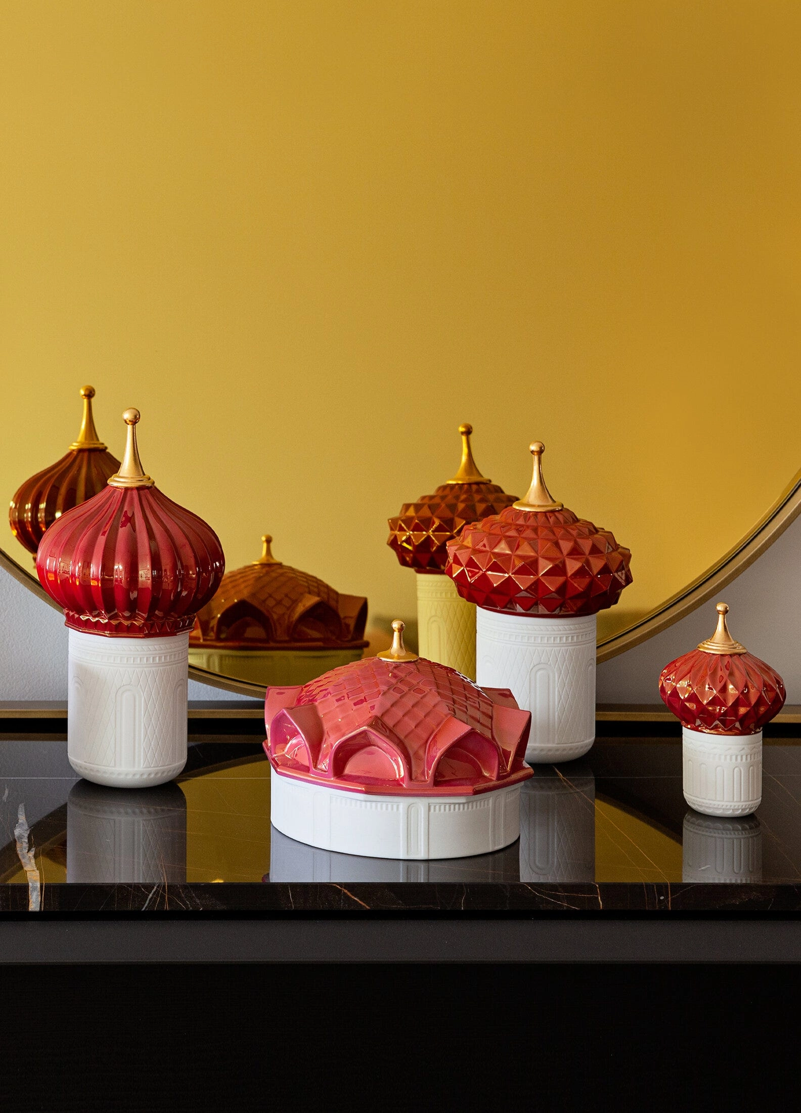 - Świeca zapachowa w kształcie wieży z czerwono-złotą opalizującą kopułą.