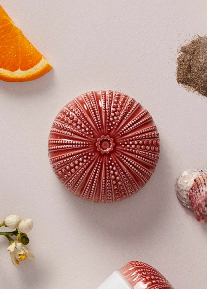 - Świeca zapachowa o owocowym zapachu z porcelanową pokrywką z motywem rozgwiazdy.