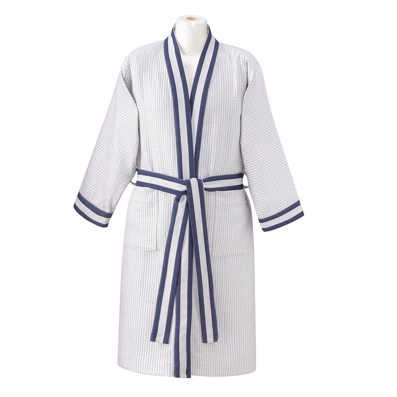 Bawełniany szlafrok kąpielowy z kolekcji Bath Club Blue. Specjalna struktura miodu sprawia, że jest niezwykle chłonny, miękki i szybko wysycha. W wyjątkowy sposób otuli Twoje ciało po kąpieli. Kolekcja Bath Club zachęca do chwili relaksu i odpoczynku z najwyższą jakością. Stworzona we współpracy z architektem Jean-Michel Wilmotte, który przeniósł linie swojego szkicownika na materiał - splot zastosowany w tej serii przypomina właśnie szkicownik o prostych, czystych liniach z współczesnym akcentem.
