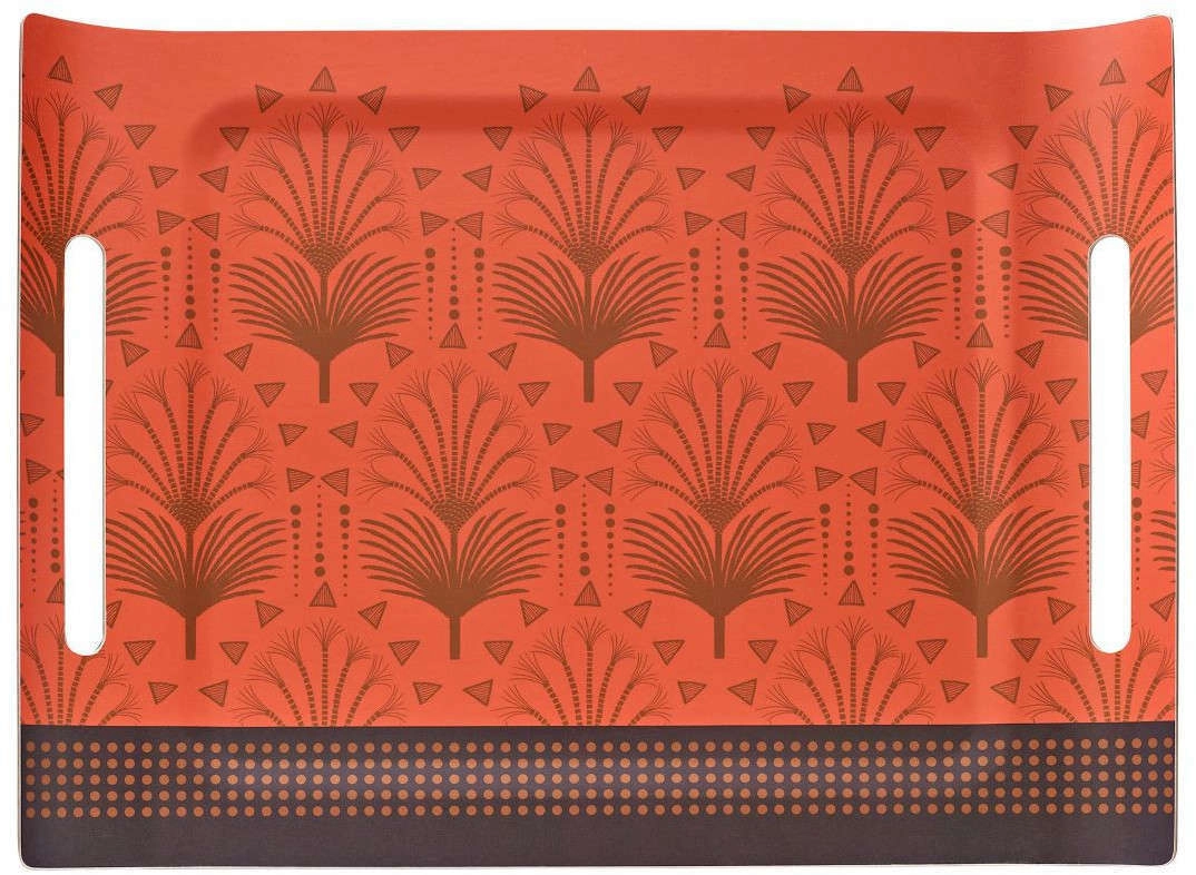 Drewniana taca z kolekcji Cabaret Flamingo. Niezwykłe zdobnictwo, złocenie i lekka nuta egzotyki w duchu Art Deco! Kolekcja Cabaret to ukłon w stronę szalonych lat XX. - żywiołowy klimat tamtych czasów został unowocześniony w najlepszym stylu. Piękne wzory palm oraz pawich piór przywołują barwne noce kabaretowe i nadają elegancji i radości do wnętrza.