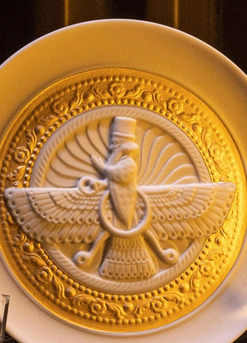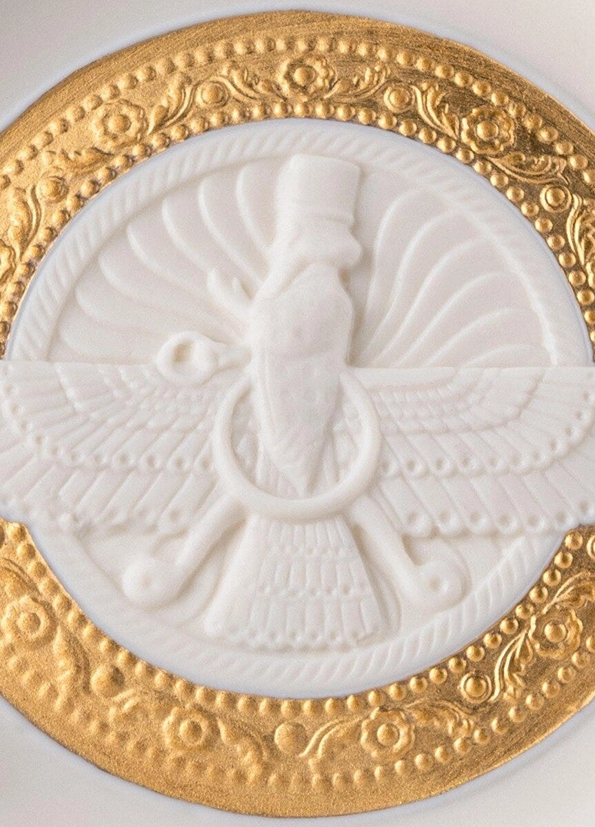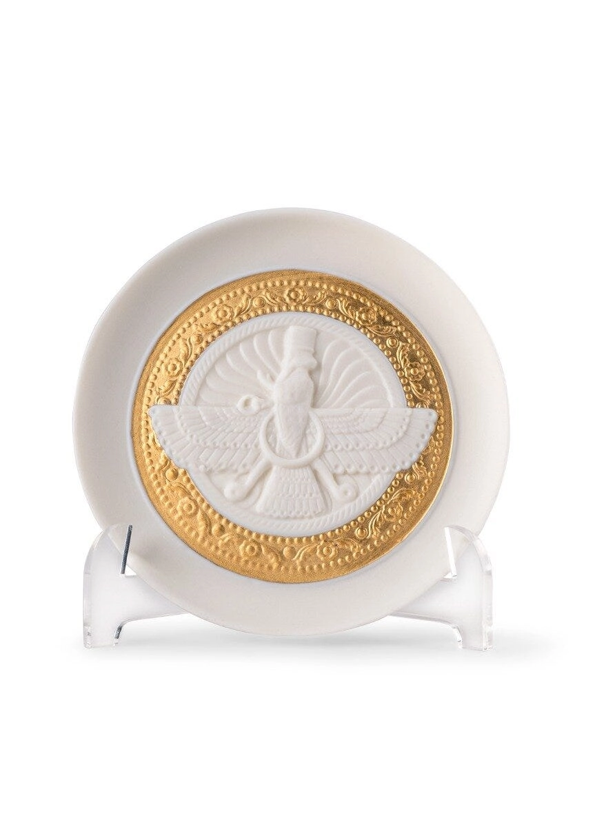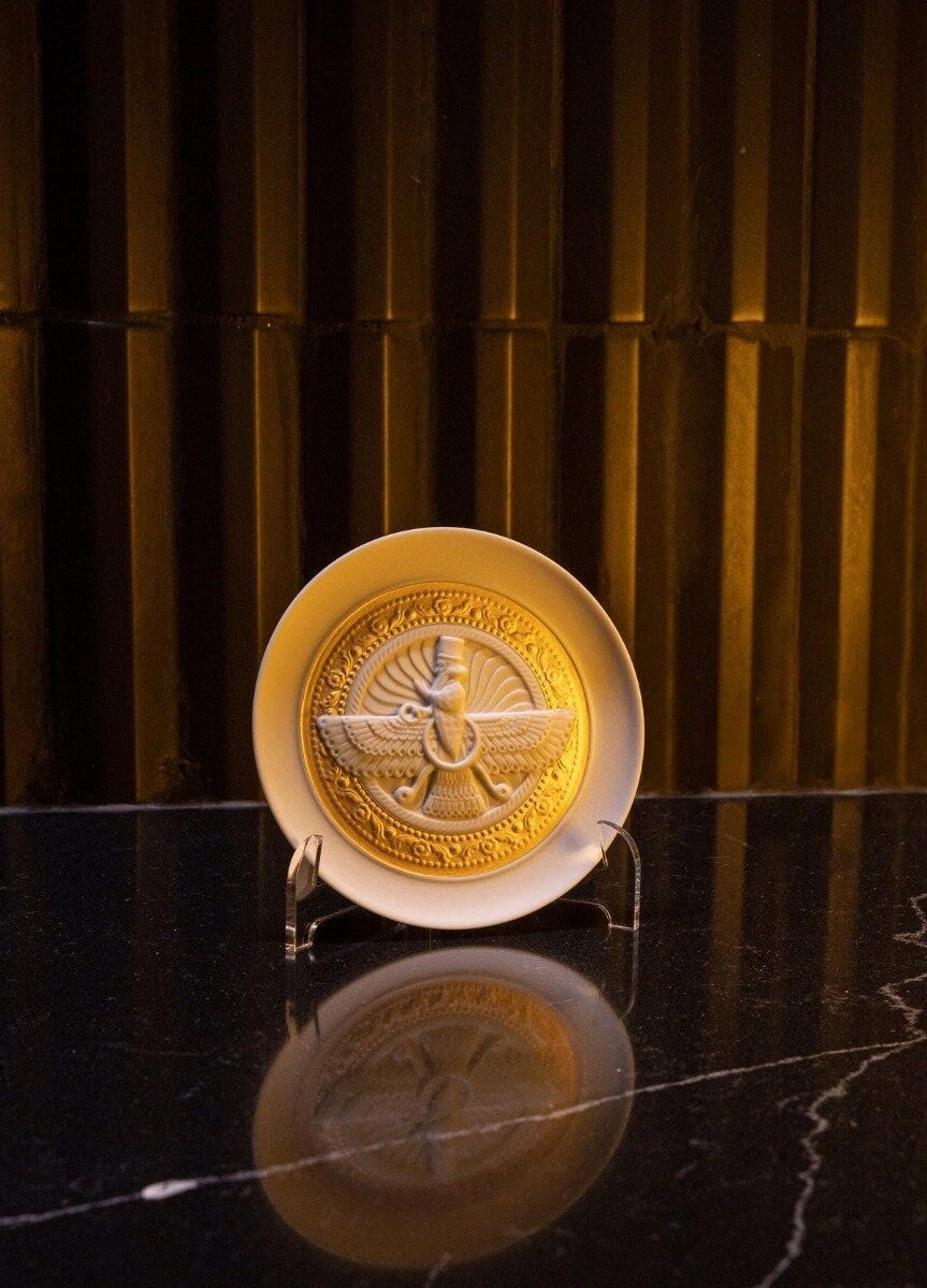 - Dekoracyjny talerz z motywem Faravahar ze złotym połyskiem.