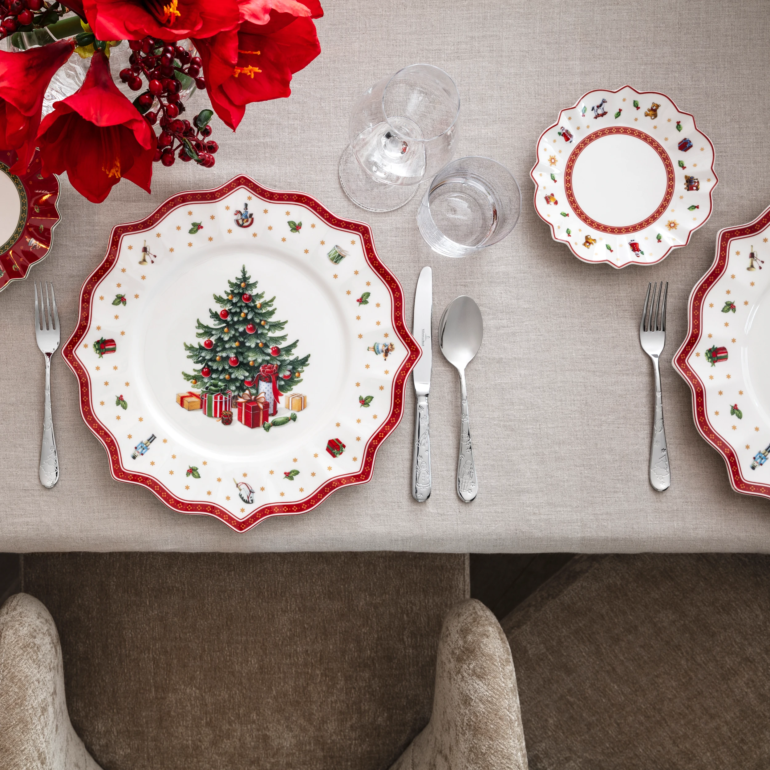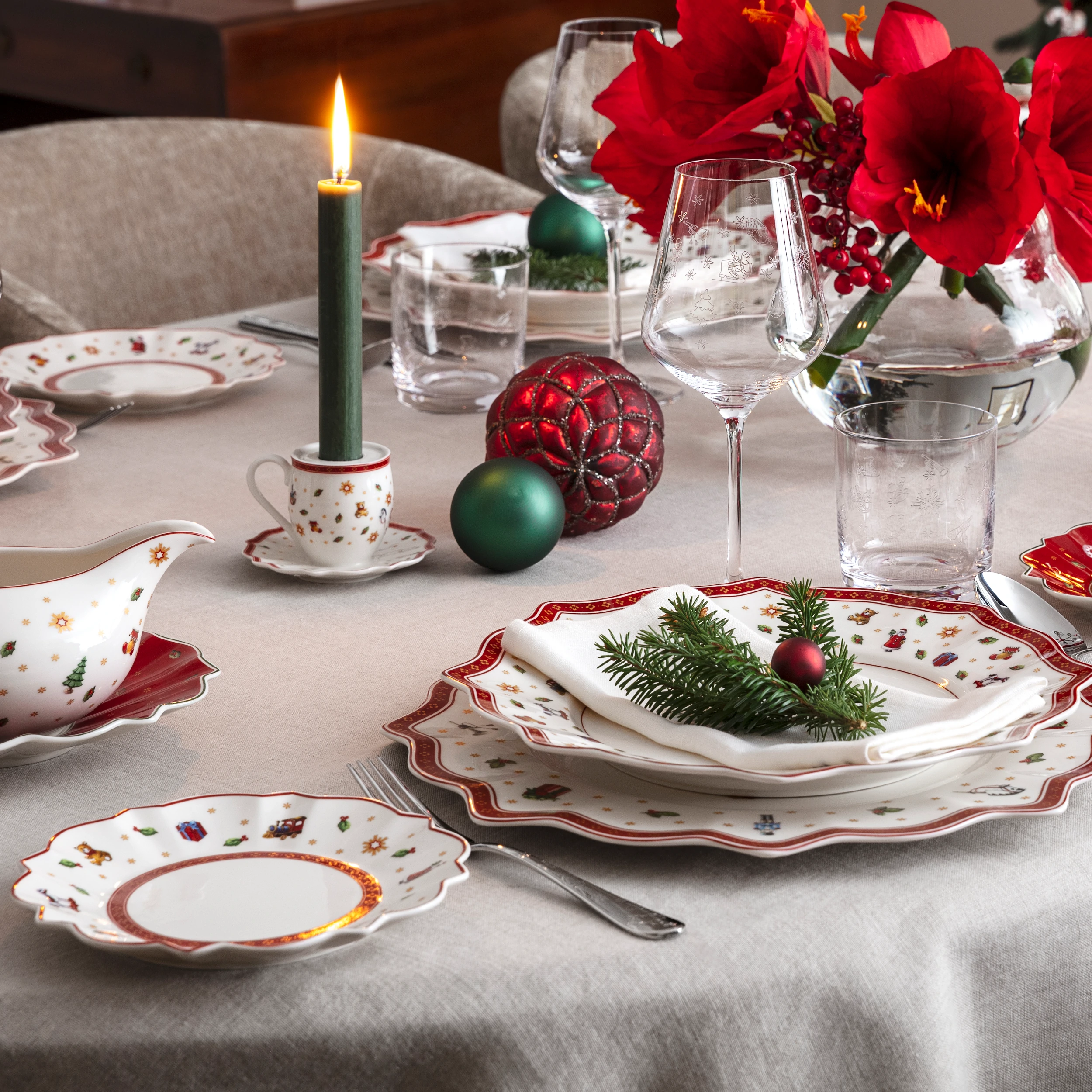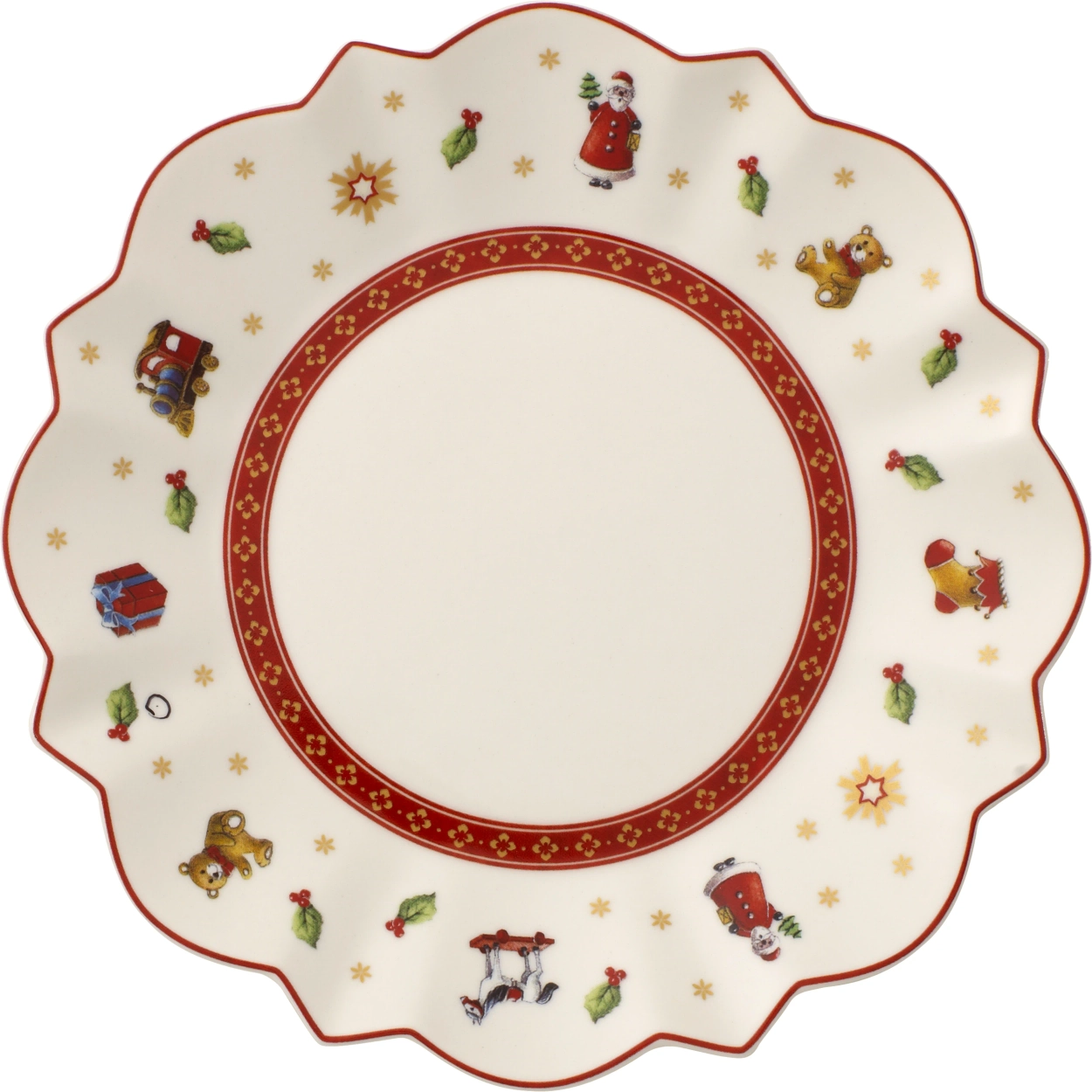 Porcelanowy talerzyk B&B w kolorze białym o średnicy 17.9 cm z  kolekcji Toy's Delight. Sprawdzi się do serwowania pieczywa z masełkiem czy małych kawałków ciasta, jak np. sernika, makowca lub babki piaskowej albo pierników. Kolekcja z Villeroy & Boch Toy's Delight Christmas obejmuje szeroki asortyment świątecznych naczyń na wigilijny stół. Różne części serwisowe są ozdobione motywami dającymi przedsmak Bożego Narodzenia. Zapraszamy na bajkową, sentymentalną podróż! Za sprawą kolekcji przygotowanych na Boże Narodzenie. Na nowo przeniesiesz się do krainy fantazji i w czas beztroski. kolekcja porcelany udekorowana świątecznymi zabawkami: Mikołaj, lokomotywa, miś, skarpeta na prezenty. Połączenie najbardziej charakterystycznych dla świąt kolorów - czerwonego, zielonego i białego z uroczymi detalami wprowadzą świąteczną atmosferę do Twojego domu.