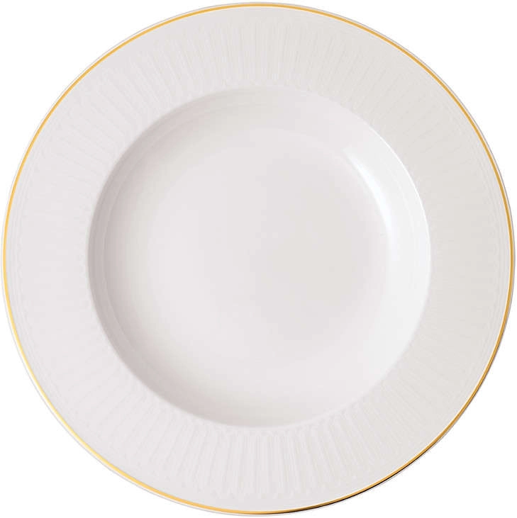 Talerz głęboki z kolekcji Chateau Septfontaines. Kolekcja Chateau Septfontaines to najnowsza odsłona luksusowej serii Signature sygnowanej przez Villeroy&Boch. Nazwa nawiązuje do historycznej rezydencji wzniesionej przez braci Boch pod koniec XVII wieku. Podczas tworzenia tej kolekcji zainspirowano się ówcześnie królującym stylem klasycznym w nowej, subtelnej odsłonie w stylu art déco. Całość to efektowna gra między błyszczącą powierzchnią porcelany, matowym zdobieniem zaprojektowanym przez samego Vileroy&Boch oraz 20-karatowym złotem znajdującym się na brzegach. Połączenie wysokiej jakości porcelany oraz najnowszych technik dekorowania sprawia, że całość jest niezwykle efektowna, czarująca, a jednocześnie nadająca się do codziennego użytku - doskonała dla koneserów porcelany na najwyższym poziomie.