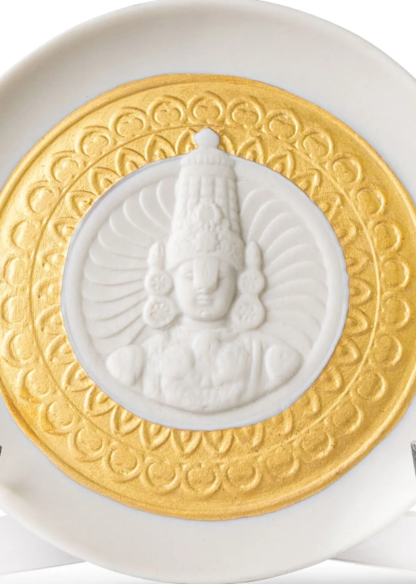 - Porcelanowy talerz z motywem Lord Balaji ze złotym połyskiem.