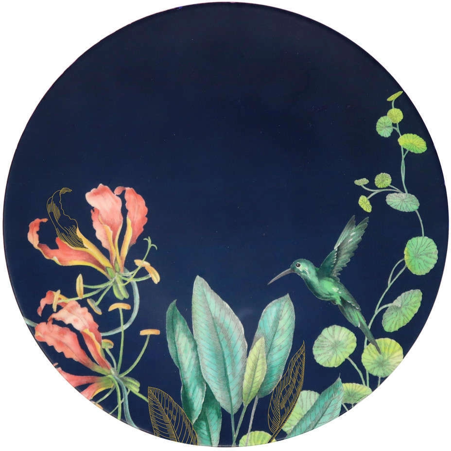 Talerz obiadowy z kolekcji Avarua. Inspiracją do stworzenia kolekcji Avarua był brytyjski odkrywca James Cook, który w 1773 roku odkrył grupę wysp na Pacyfiku, nazwaną później archipelagiem Cook'a. Stolicą wysp Cooka jest właśnie przepiękna, kolorowa Avarua. Wykwintna, bogata dekoracja na szlachetnej porcelanie kostnej pozwoli wprowadzić egzotyczną, pełną barw atmosferę w Twoim wnętrzu i na Twoim stole. Przewijające się motywy kwiatów - czerwona Gloriosa superba, namorzyny, liście Strelicji i barwnych kolibrów - na niebieskim lub czysto białym tle pozwalają odkrywać fantazyjną faunę i florę każdego dnia. Całość dopełniają przepiękne detale z prawdziwego złota, które nadają całości trójwymiarowego wyglądu i niezwykłej elegancji. Wprowadź egzotyczną i wykwintną kolekcję Avarua do swojego domu!